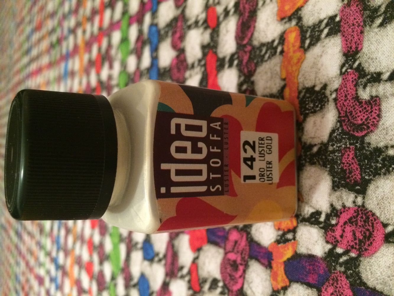 Descrizione:Colore per stoffa oro, aperto e usato un pochino poi più usato per parecchio tempo. Il colore è ancora bello fluido, il boccettini praticamente pieno.