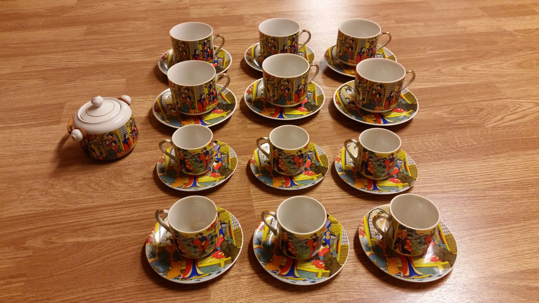 Set composto da 6 tazze, 6 tazzine e zuccheriera. Una tazza è rotta sul fondo e una tazzina è sbeccata. Molto bello e delicato, sempre tenuto in credenza da mia mamma. Credo risalga agli anni 70/80. Sul fondo delle tazze e tazzine, se guardate in controluce, appare la figura di una donna giapponese. Spedisco solo al diretto interessato per ovvi motivi.