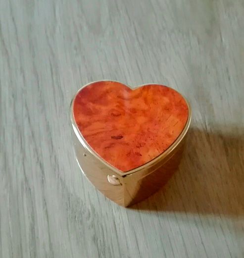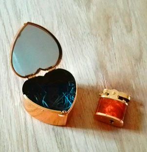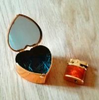 Piccolo scrigno in metallo dorato e radica che racchiude uno specchietto sul retro del coperchio e al suo interno custodisce un minuscolo accendino anch''esso in metallo dorato e radica, ricaricabile (da ricaricare, manca il liquido infiammabile). Meccanismo perfetto, oggetto regalabile.
