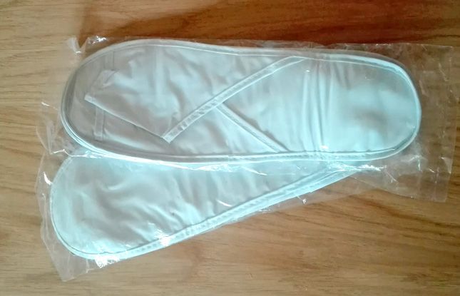 Descrizione:Due coppie di pantofole in plastica bianca da bagno, imbustate, mai usate, di quelle che si trovano negli alberghi. Una confezione ha l'involucro di cellophane rotto ma non è mai stata usata.