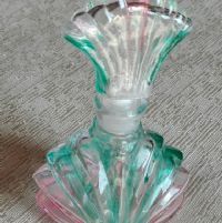 Bottiglietta in vetro colorato rosa e azzurro, con tappo in vetro. Altezza cm 11, adatta a profumi e acque profumate.