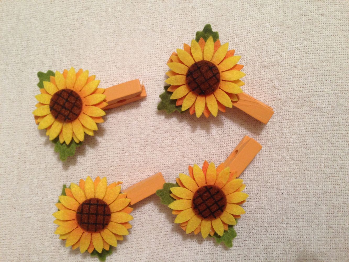Quattro mollette decorative arancioni lunghe circa 7 centimetri con girasole in feltro applicato