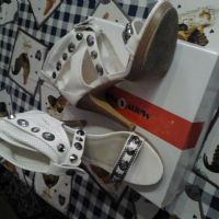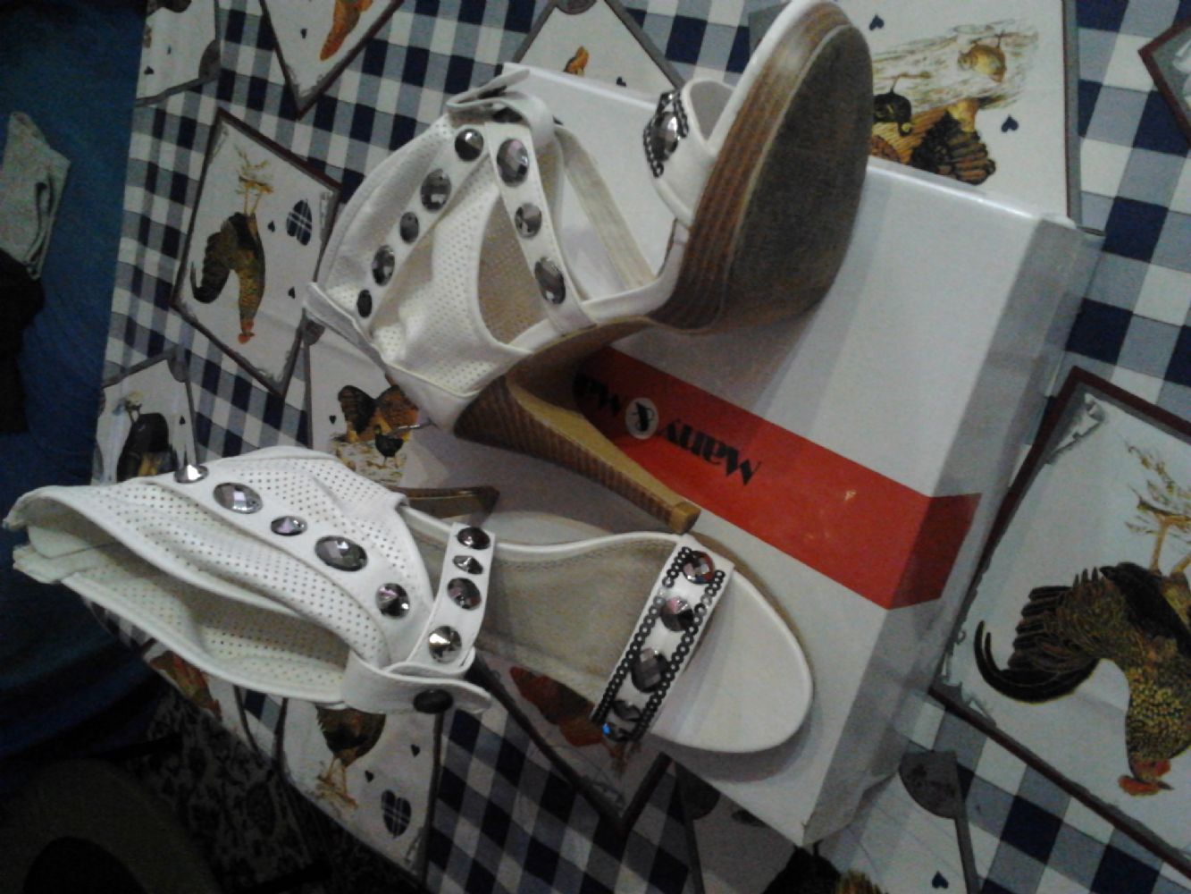 Descrizione:scarpa/ mezzo stivale estivo, aperto davanti, bianco con gemme nero/argento in plastica e strass, zip dietro e sottopiede in pelle, fascia sulla caviglia traforata. tacco circa 12 cm.