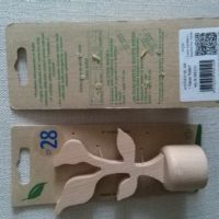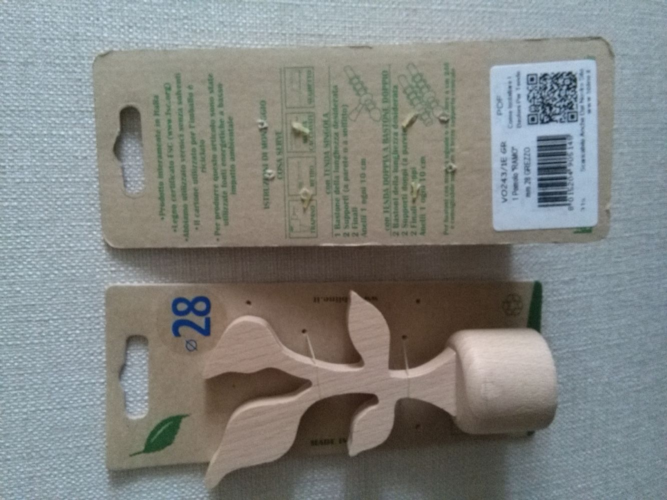 Parte finale dell'asta per le tende, sono due, in legno chiaro, a forma di foglia. Sono nuovi, ancora imballati; ne avevo presi tre, ma questi alla fine non li ho mai usati (erano per il salotto).
