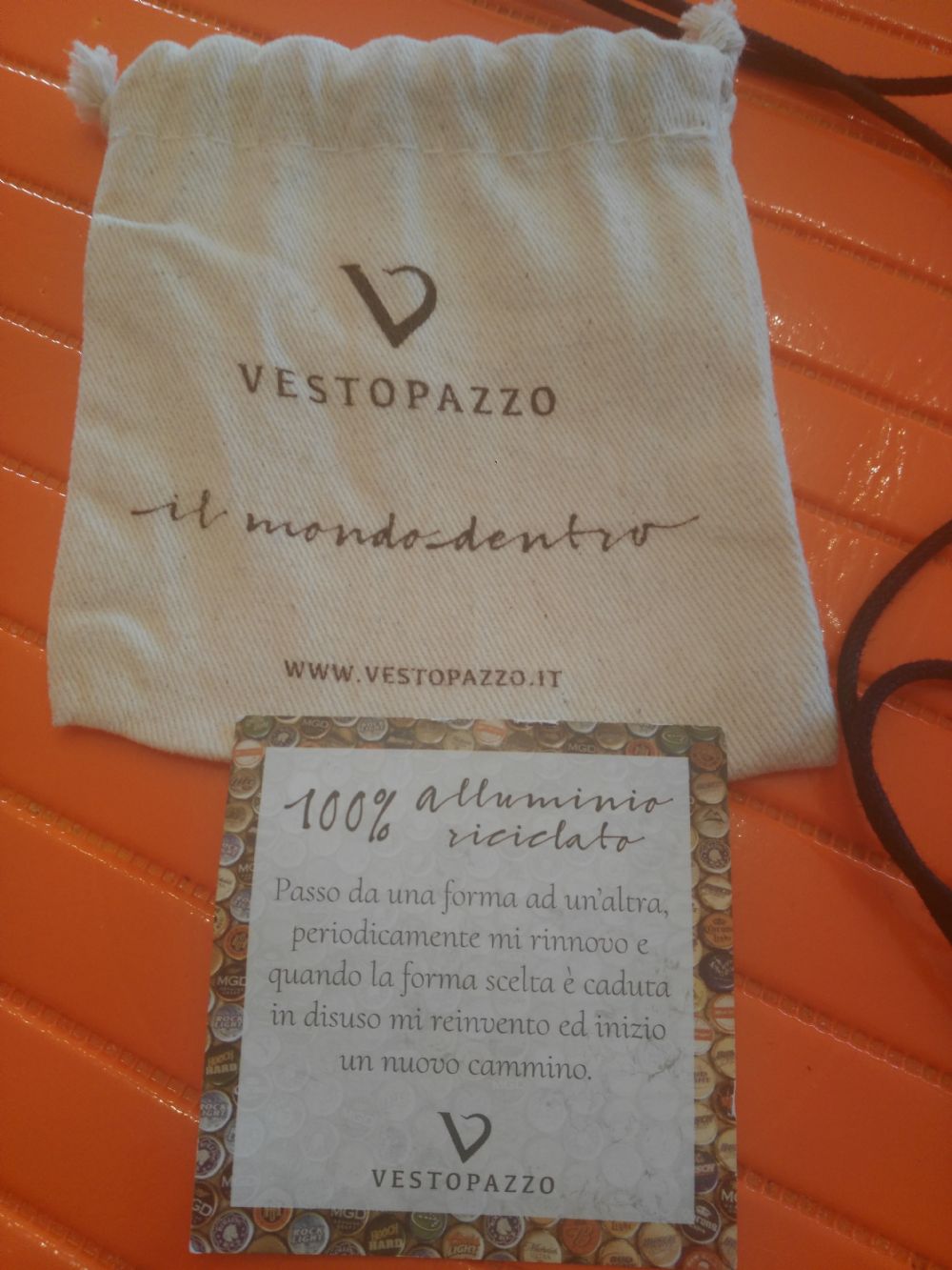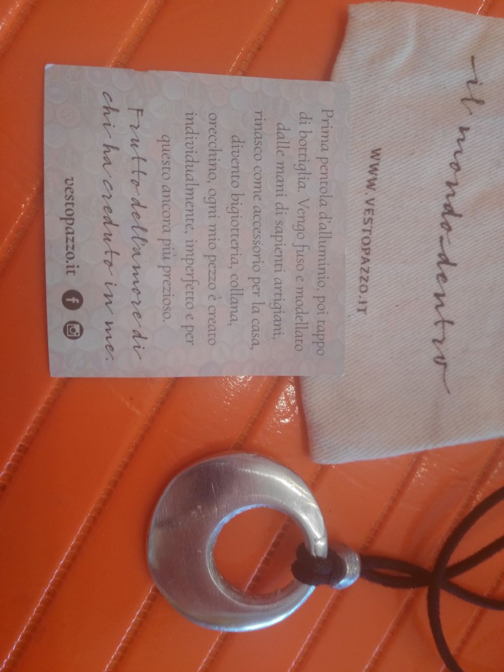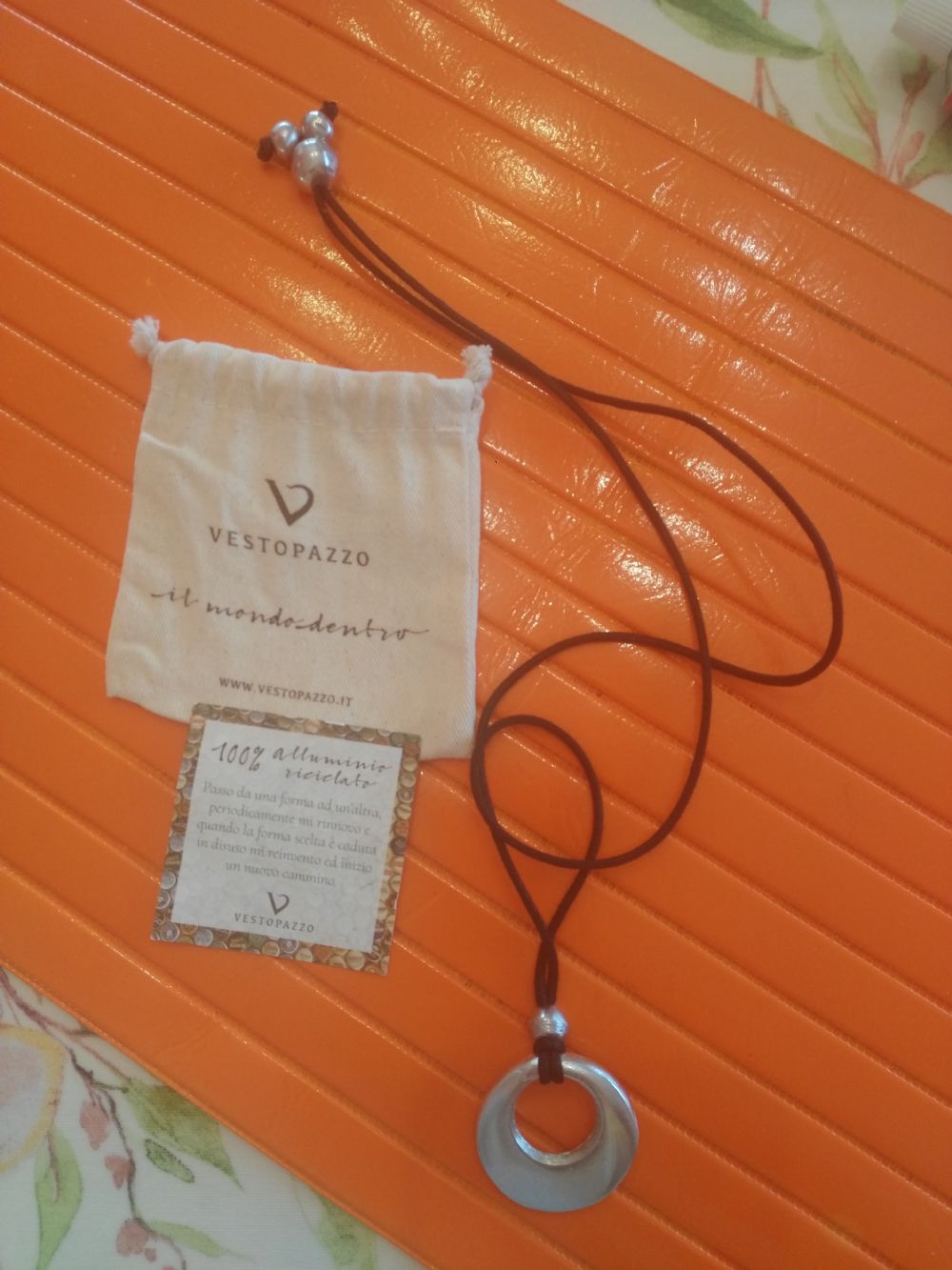 Metto usata poco ma l'' ho usata solo una volta..collana lunga regolabile con ciondolo in alluminio riciclato..marca vestopazzo ho anche la certificazione e il sacchettino..