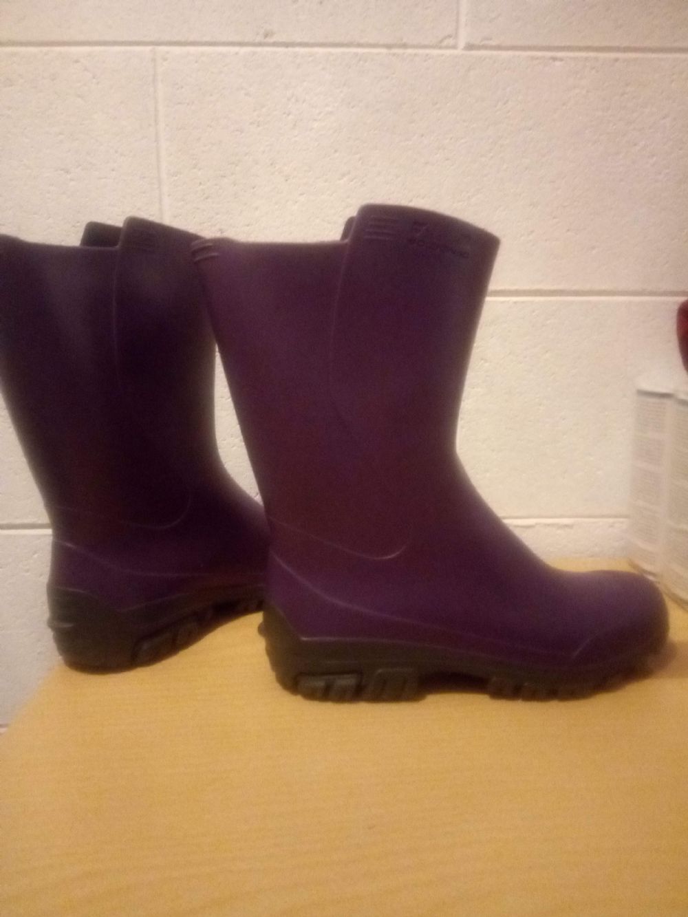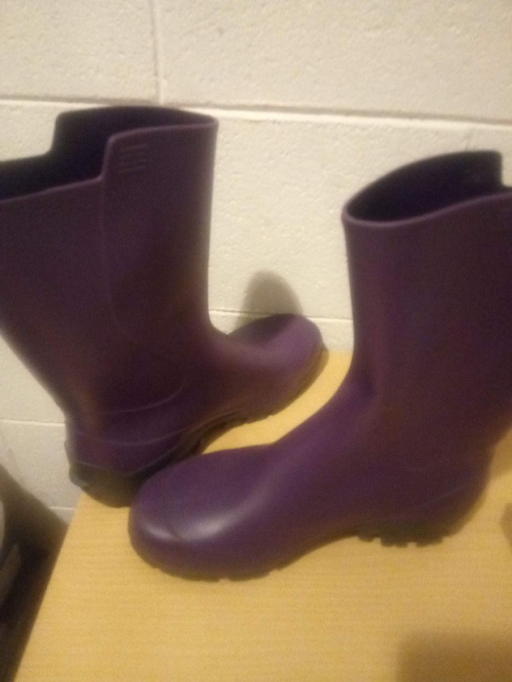 Descrizione:Stivali n. 39 antipioggia, color viola, altezza 28 cm dalla suola alla parte più alta.