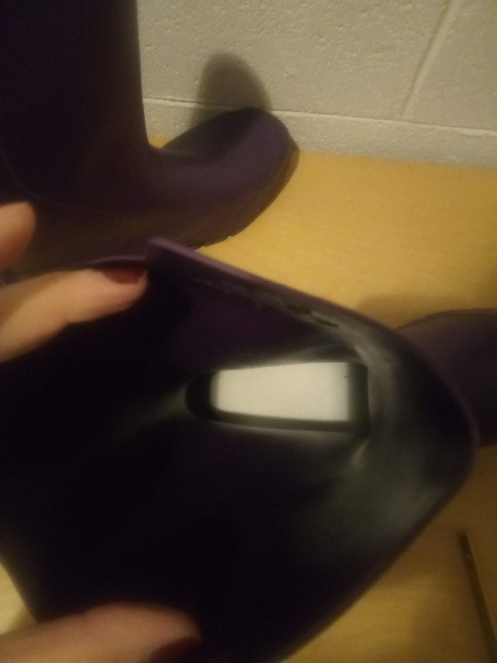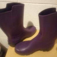 Stivali n. 39 antipioggia, color viola, altezza 28 cm dalla suola alla parte più alta.