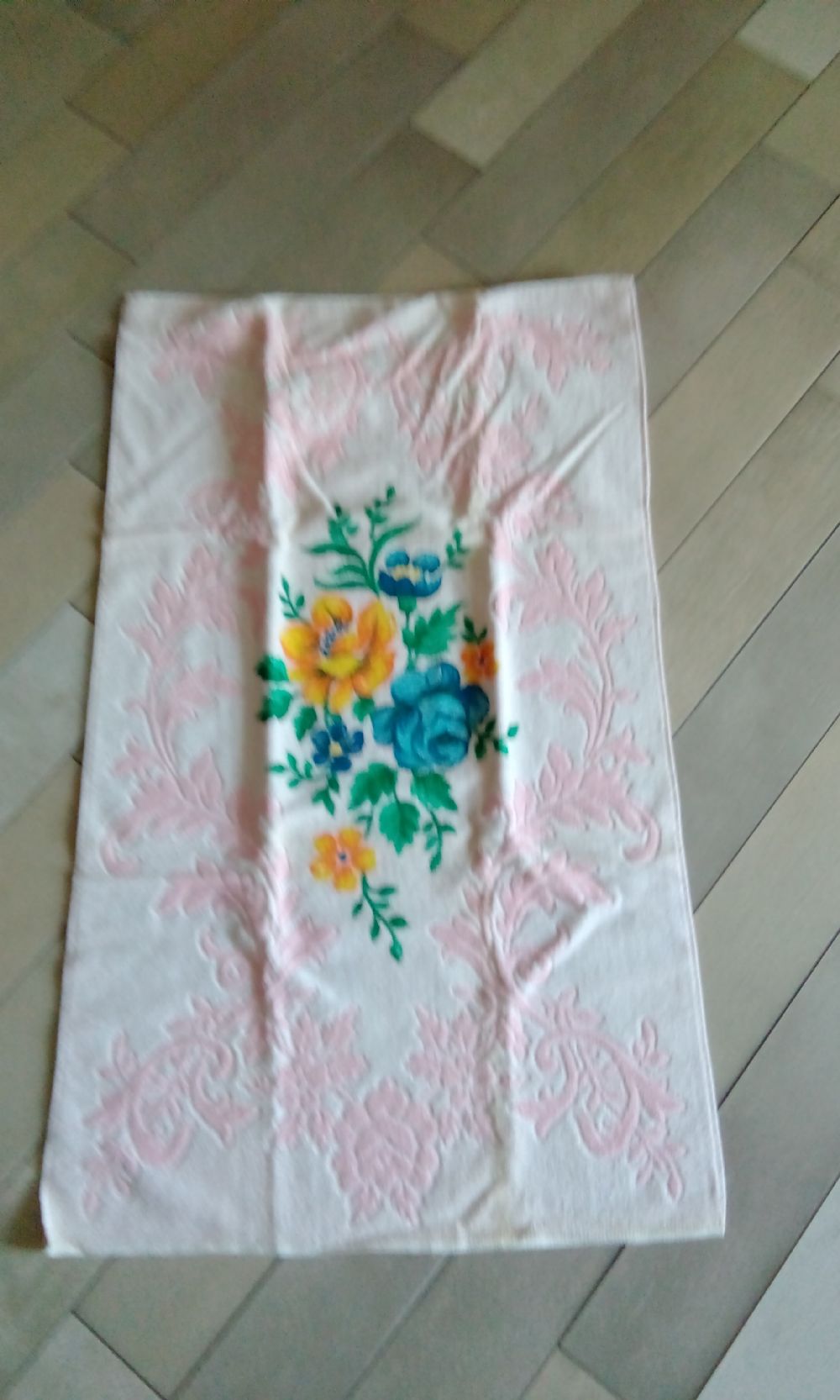 Asciugamano medio di un buon cotone color rosa con fiori colorati in centro. Misure: 60 per 102cm.