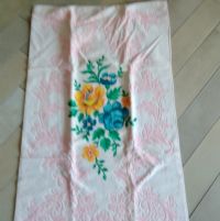 Descrizione:Asciugamano medio di un buon cotone color rosa con fiori colorati in centro. Misure: 60 per 102cm.