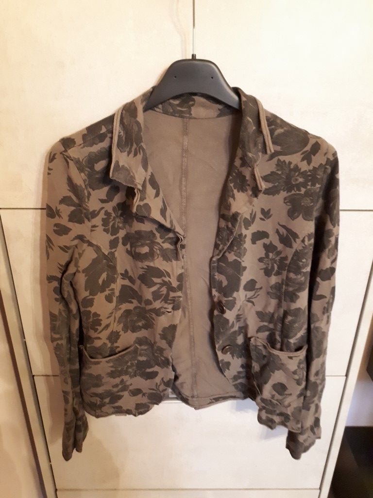 Descrizione:giacchina color marrone/beige taglia M, in tessuto leggero, quindi non è rigida. solo un po' stropicciata, nessun difetto particolare