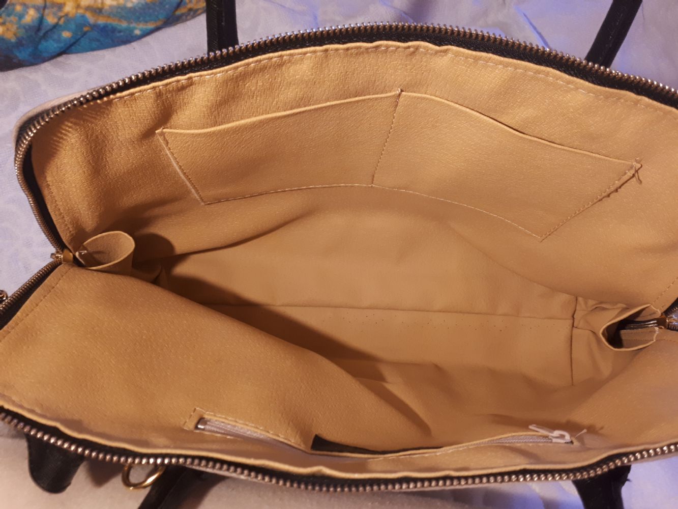 Il fondo, i manici e la tracolla sono perfetti, nessun segno di usura. Non so se sono in pelle, mentre l''interno è in vera pelle Made in italy, con il marchio "genuine leather", perfetto come uscito dal negozio, qualsiasi difetto presente è di fabbricazione o della pelle.
