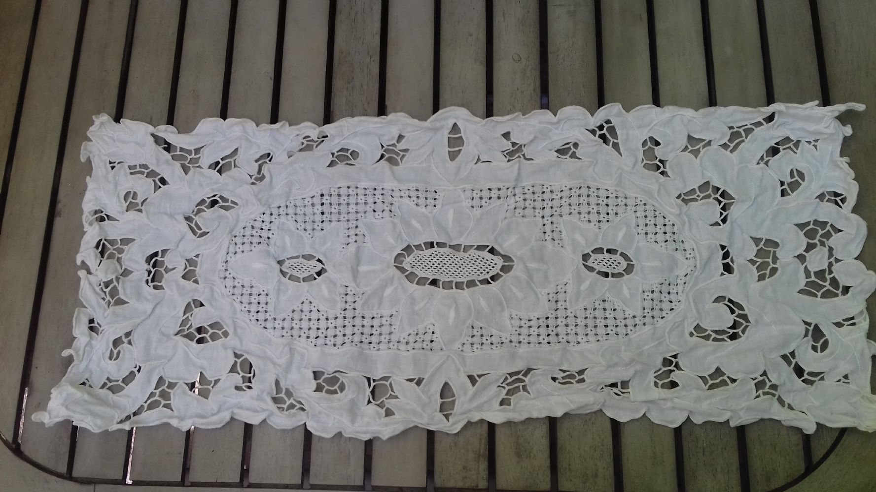 Centrino rettangolare centrotavola, di colore bianco, cotone. Misure cm. 62 x 30