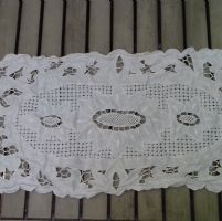 Descrizione:Centrino rettangolare centrotavola, di colore bianco, cotone. Misure cm. 62 x 30