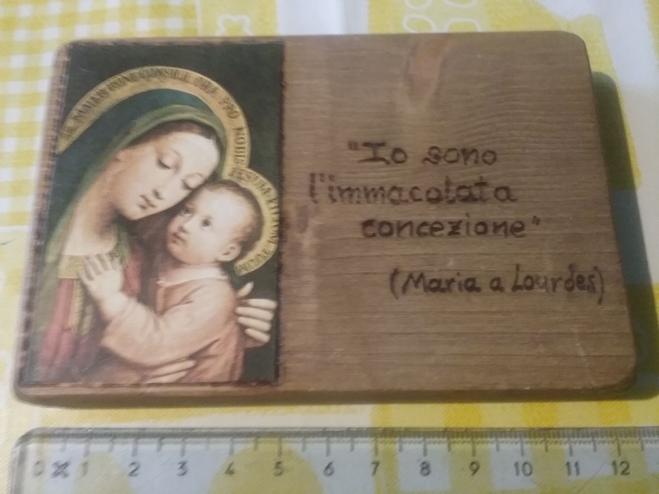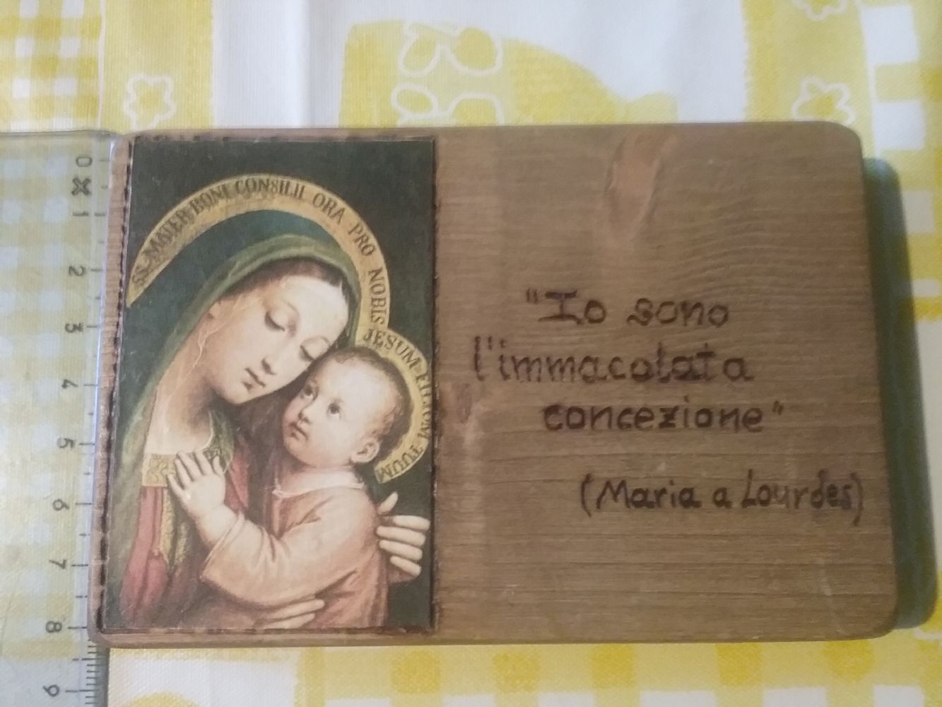 Descrizione:Icona in leno, con iscrizione, realizzata dalle Clarisse di Montone. Era una bomboniera di una prima comunione, quindi con il pirografo dietro c'e' inciso un nome e una data. Invio foto in privato a chi interessa. Precedenza a Celeste.