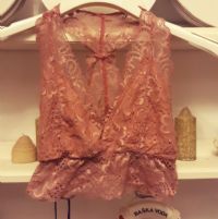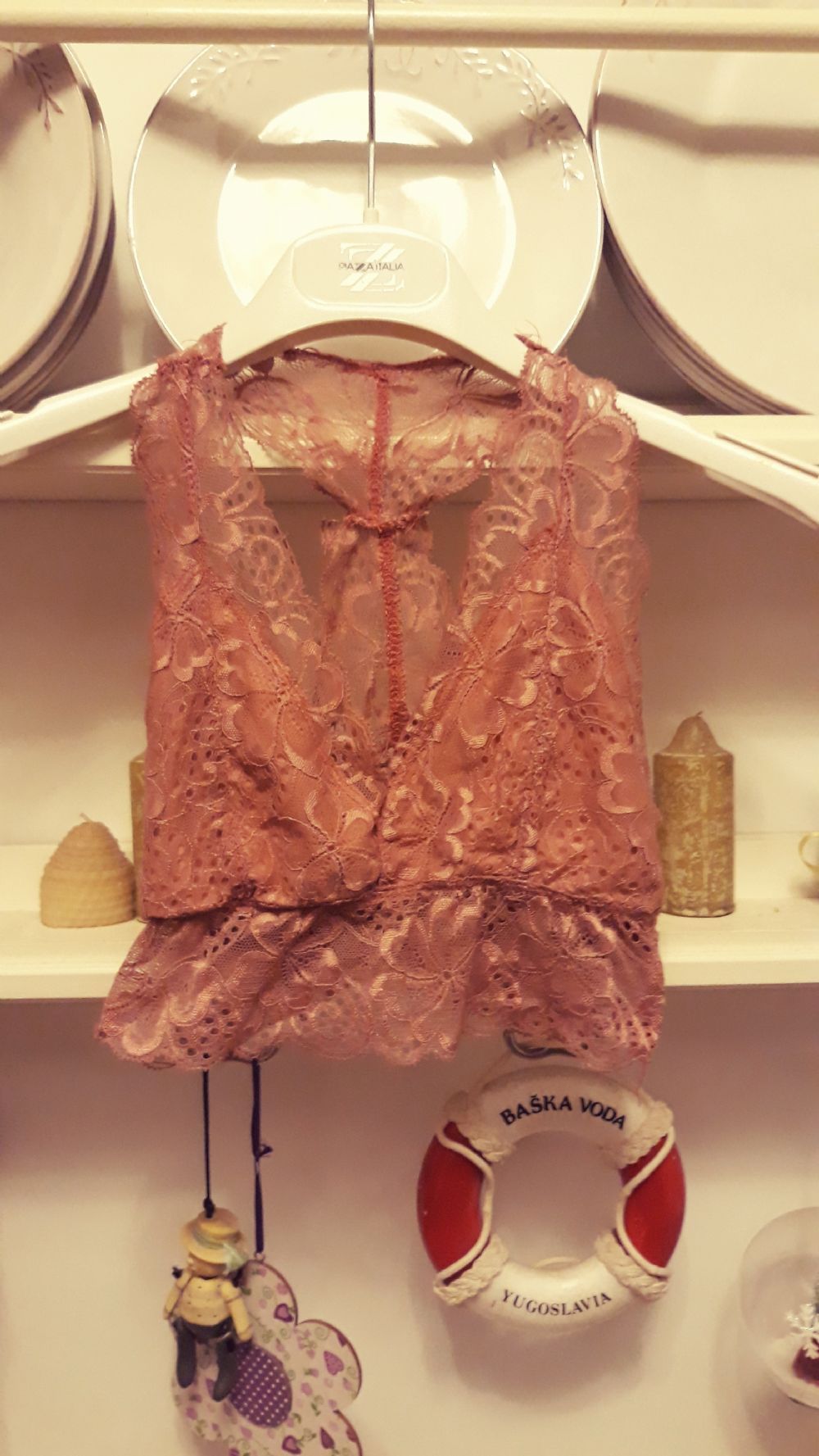 Reggiseno in pizzo lavorato, colore rosa antico (più chiaro che in foto), molto carino, con bretelle che si uniscono al collo e decorano la schiena (vedi foto), merletto tutto intorno, comodo senza ferretto, carino anche da indossare come top sotto una maglia o una giacca. La targhetta è stata tagliata, ma dovrebbe essere una seconda/terza .