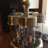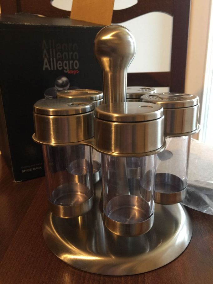 Portaspezie con 5 contenitori, nuovo, con scatola ed imballi. Gira in un armadietto in cucina da qualche anno, in metallo color silver, la parte trasparente mi sembra plastica o plexiglas, non mi sembra vetro.