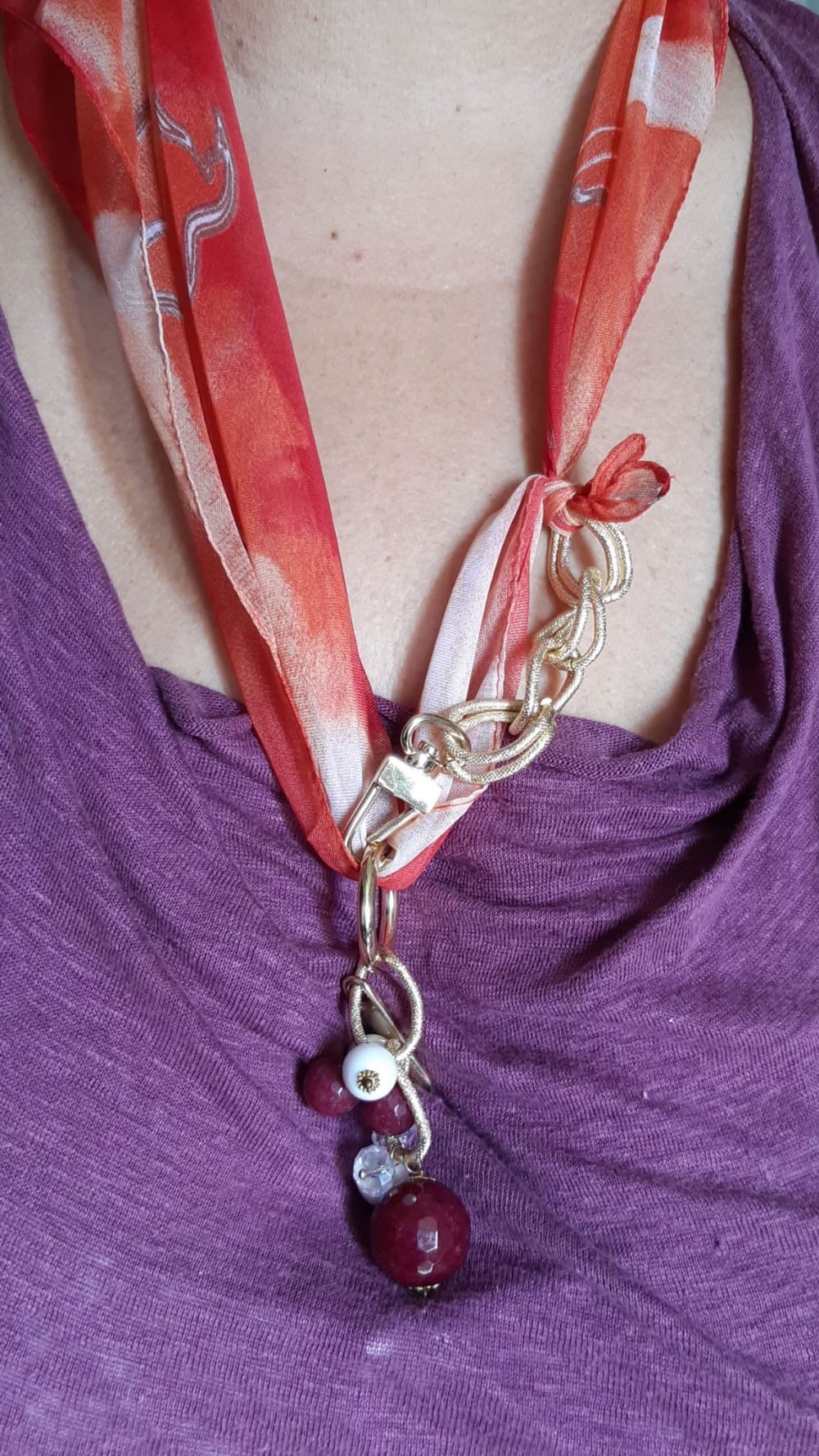 Descrizione:foulard particolare. Si mette al collo poi i pendenti possono essere chiusi o lasciati separati.