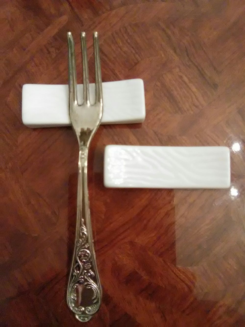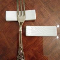 2 poggia posate in ceramica bianca smaltata, impreziositi da ondulature. Nuovi, mai usati, perfetti per le cene a due a lume di candela .. e per proteggere le tovaglie ;). Perfetti davanti, dietro hanno dei segni più scuri dove appoggiano, la parte gialla è solo dovuta alla colla dell'etichetta che ho levato, cmq si pulisce!! Forchetta NON inclusa!!! Dimensioni: 6.5x4.5 cm