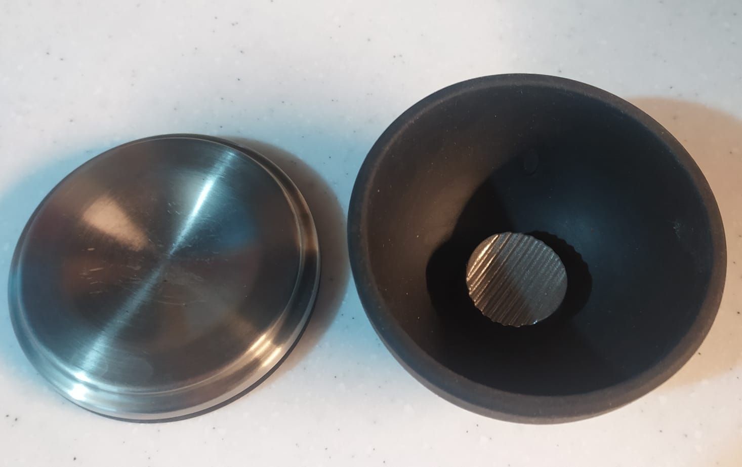 In pratica lo schiaccia noci ha una base (quella tonda in metallo dove va appoggiata la noce) e la cupolina in gomma con una parte metallica centrale che serve a rompere la noce. Metti lo schiaccia noci sul tavolo, lo apri, ci metti la noce dentro, lo chiudi e premi con forza la cupola morbida, facendo attenzione a centrare la noce con la parte metallica all'interno. Non so se mi sono spiegata bene... :D