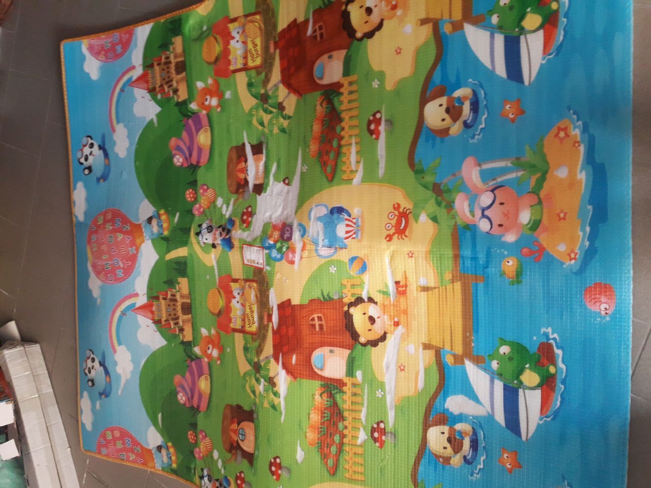 Descrizione:Tappetone per bebe'. Ha qualche piccolo difetto e manca un pezzo di bordo . Gigante: 1.80 mt x 1,50