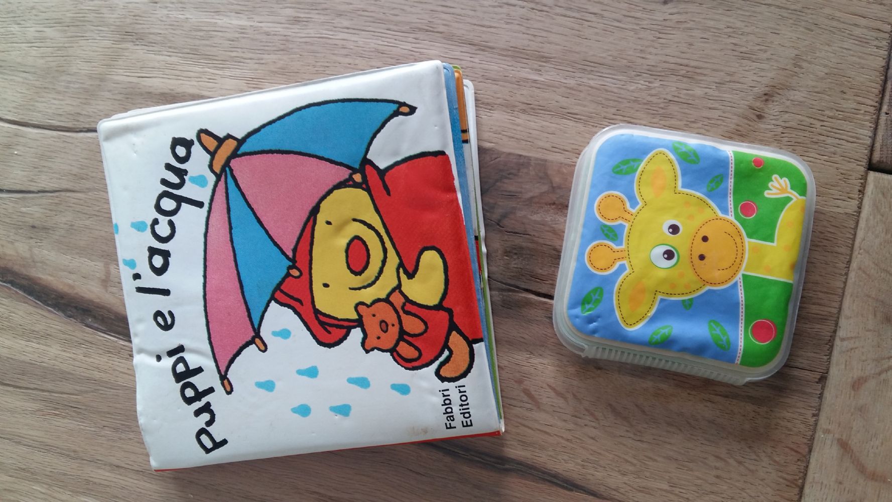 Descrizione:due libri morbidi per bambini, uno molto piccolo con sonaglio. Entrambi adatti per la spiaggia.