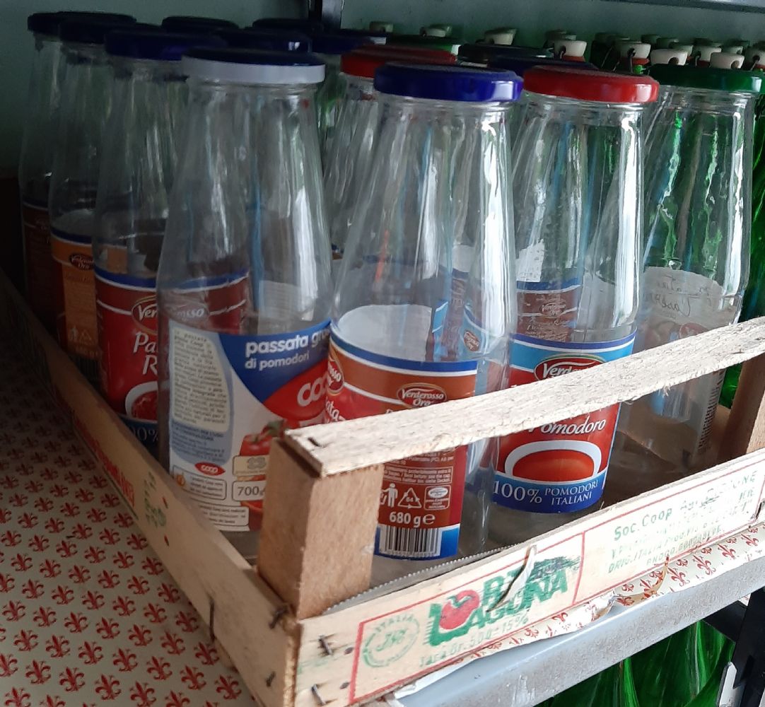18 bottiglie di passata tutte uguali. Lavate con coperchio in ottimo stato.
