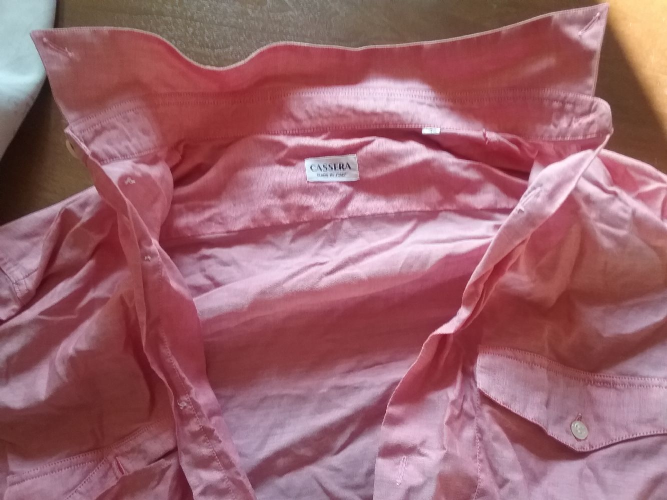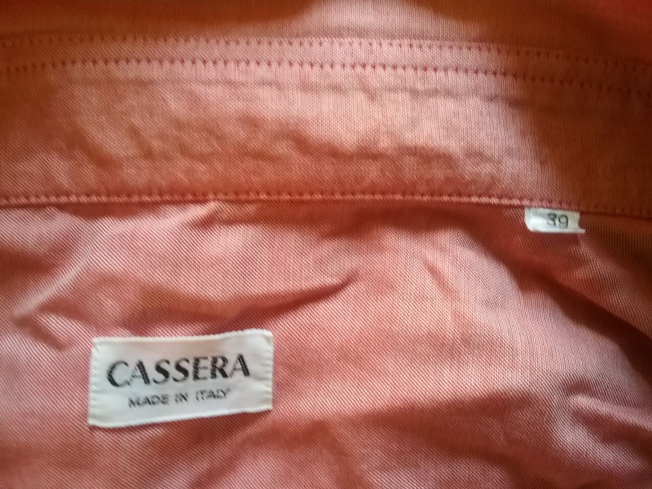 Camicia da uomo collo 39. E'' nuova, ma e'' un fondo di magazzino. A causa dell''umidità in alcuni punti gli spilli si sono arrugginiti e per toglierli hanno creato un miniforo e una macchiolina. La camicia è di qualità, 100% cotone e la stoffa è lavorata in modo da dare un dell''effetto lucente. Probabilmente se indossata in inverno con un maglione è portabilissima. E'' un vero peccato buttarla come straccio. Regalo sperando che abbia ancora una chance o indossate o per riciclo....