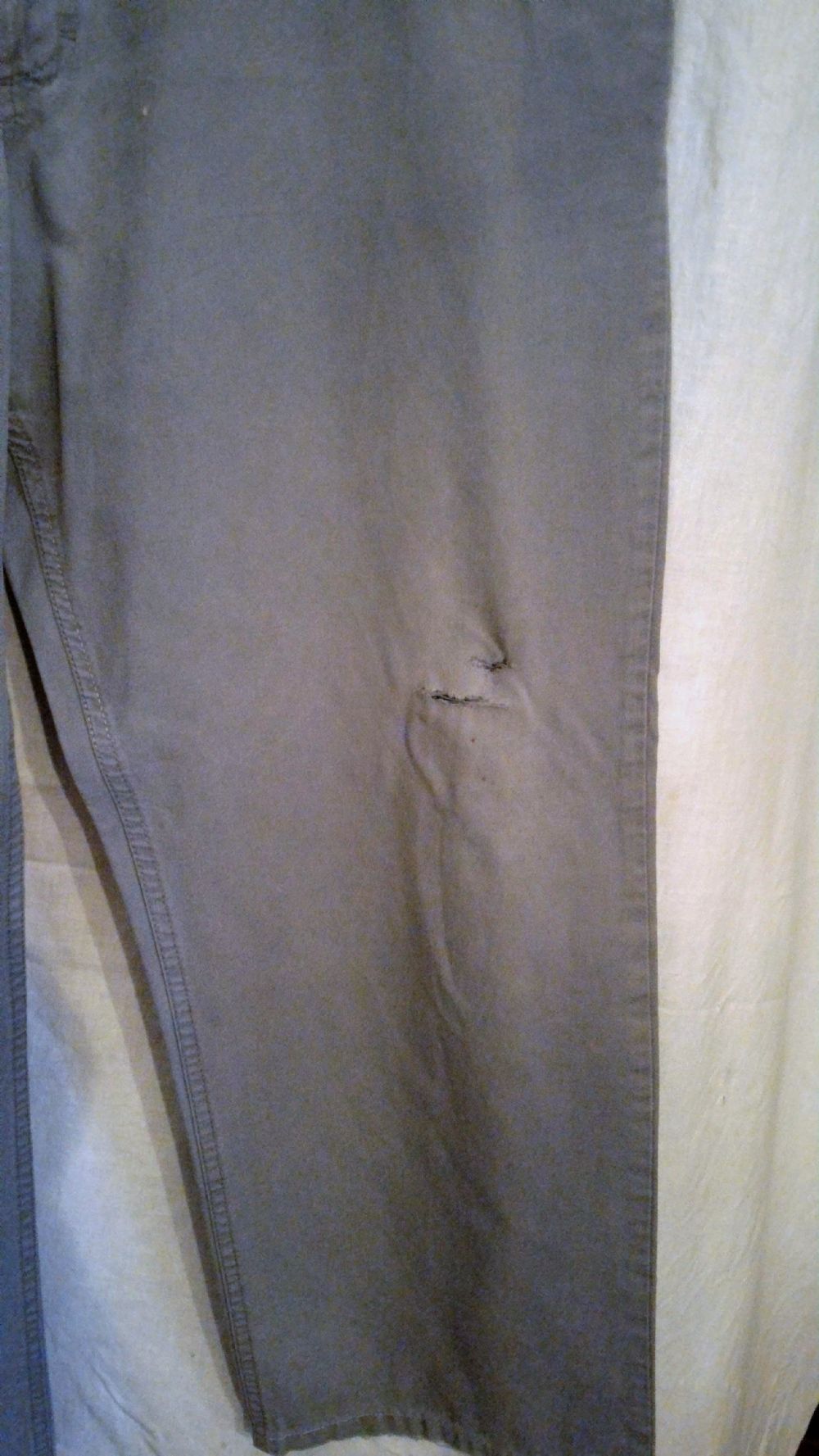 Descrizione:Color grigio chiaro, un pò usurati fondo gamba, e davanti cerniera , piccolo strappo al ginocchio sinistro e macchioline .