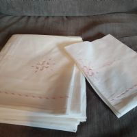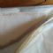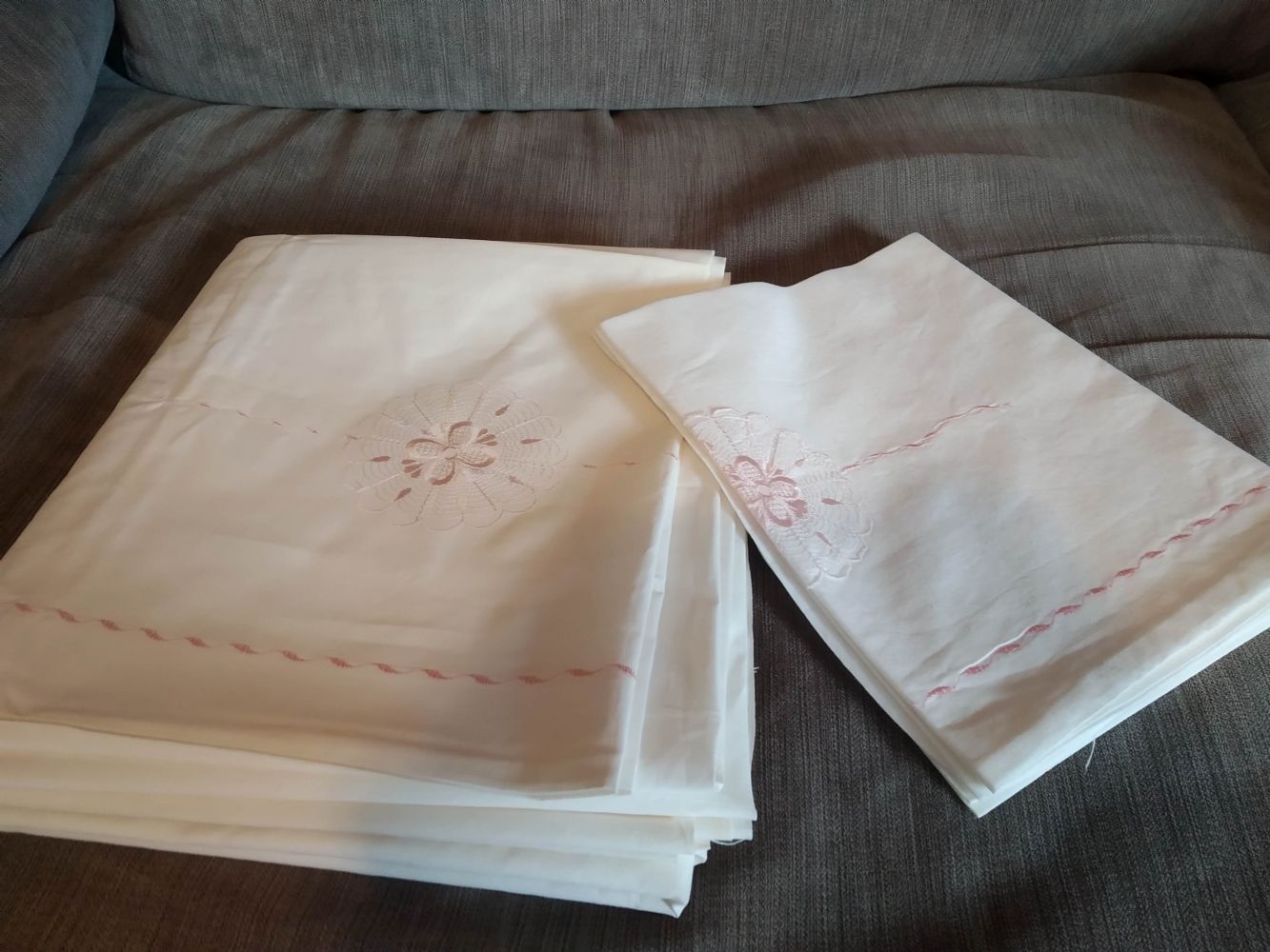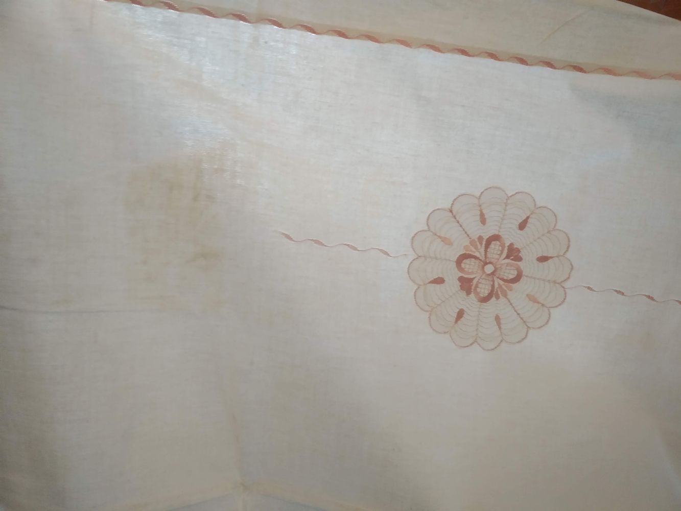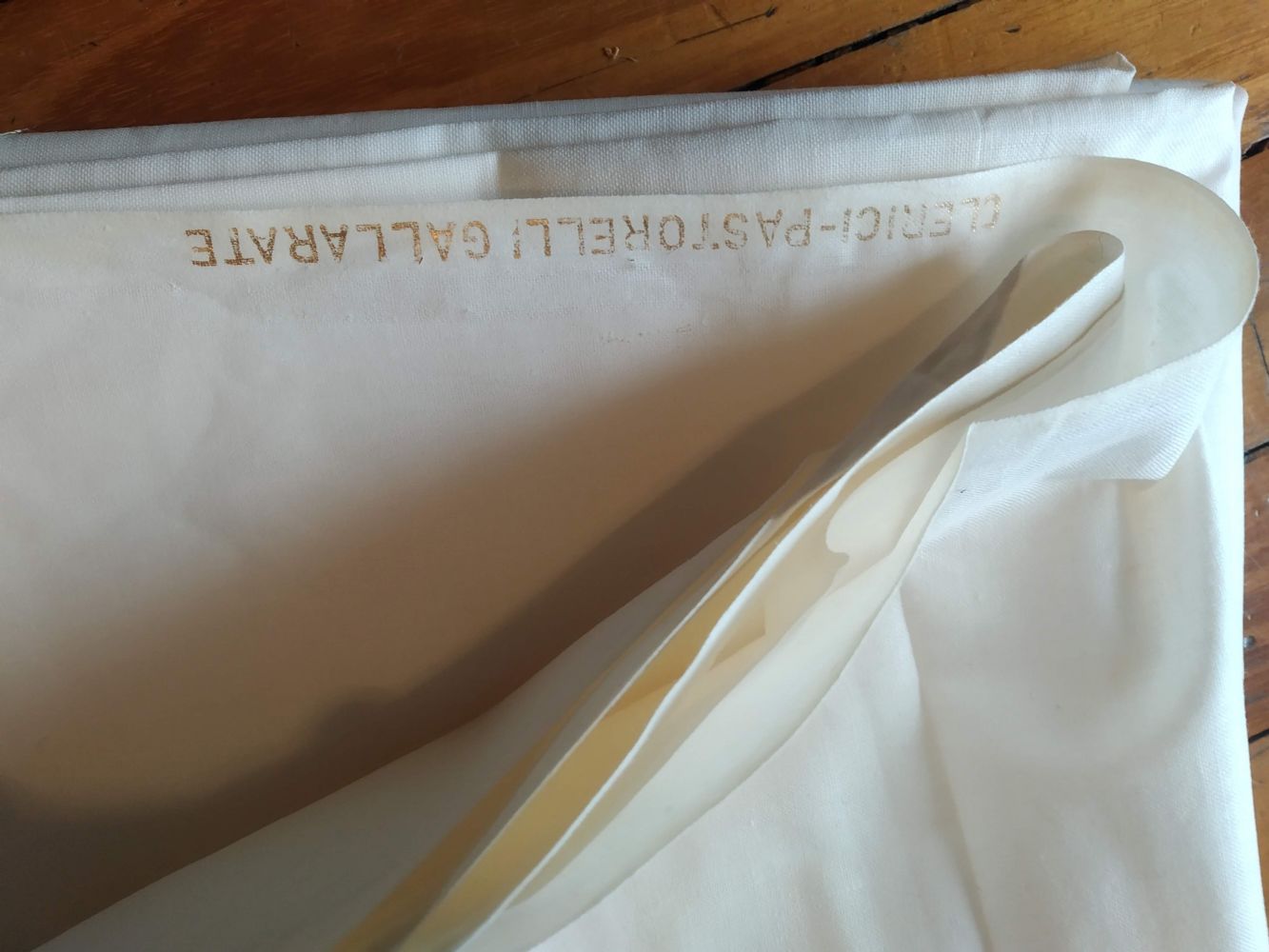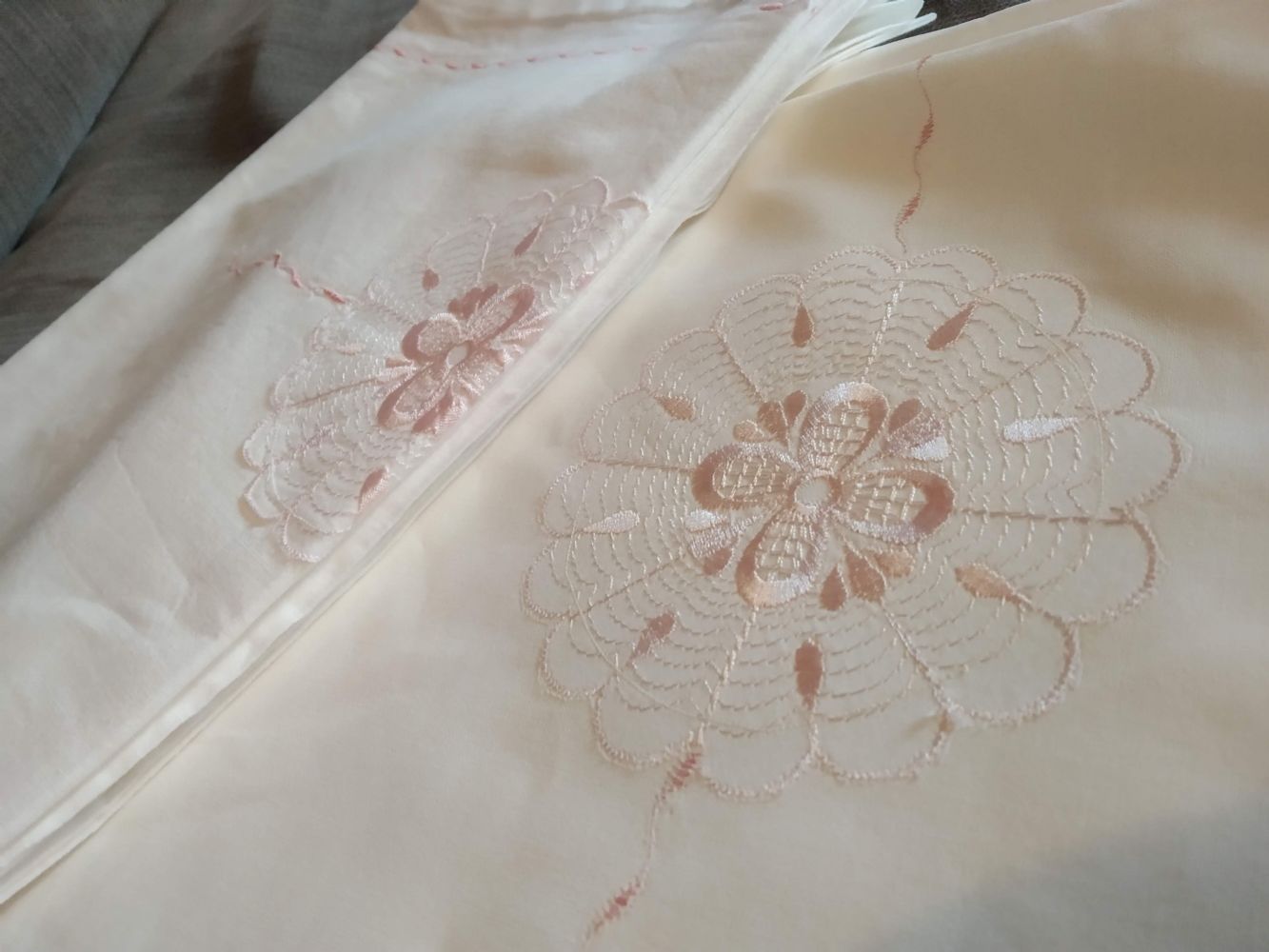 Il lenzuolo matrimoniale è più lucido, sembra quasi raso di cotone (ma potrei sbagliare). Da segnalare varie macchie soprattutto sui bordi/pieghe, il classico ingiallimento da armadio.