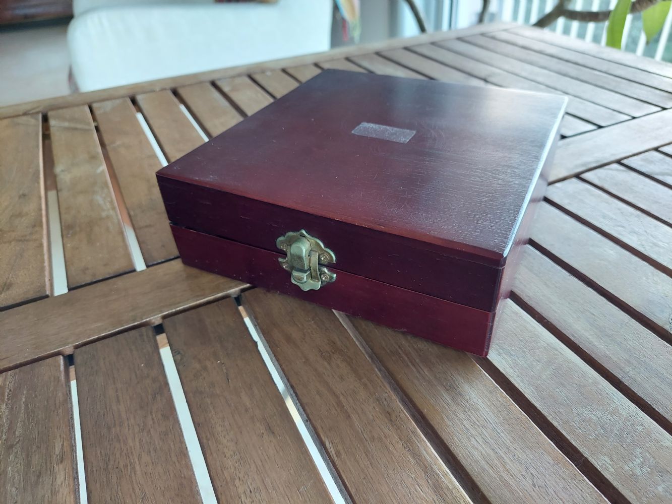 Descrizione:Set SCATOLA in legno per la cura del Vino composta da 1 beccuccio per versare 1 termometro 1 corona salvagoccia 1 tappo ermetico in acciaio