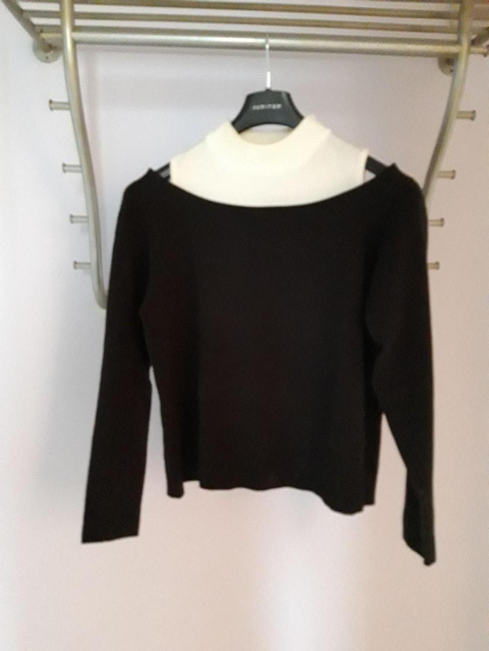 Descrizione:Maglioncino bianco/blu scuro particolare, con spalle parzialmente scoperte.