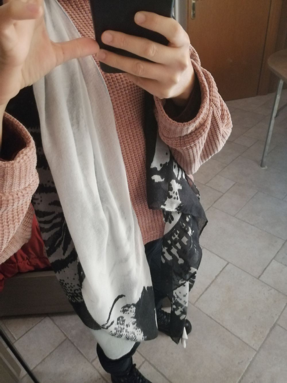 Foulard, usato abbastanza. Cedo perché ne ho altri simili. Ha delle fantasie bianche e nere e sta benissimo con tutto. Adatto per le mezze stagioni!