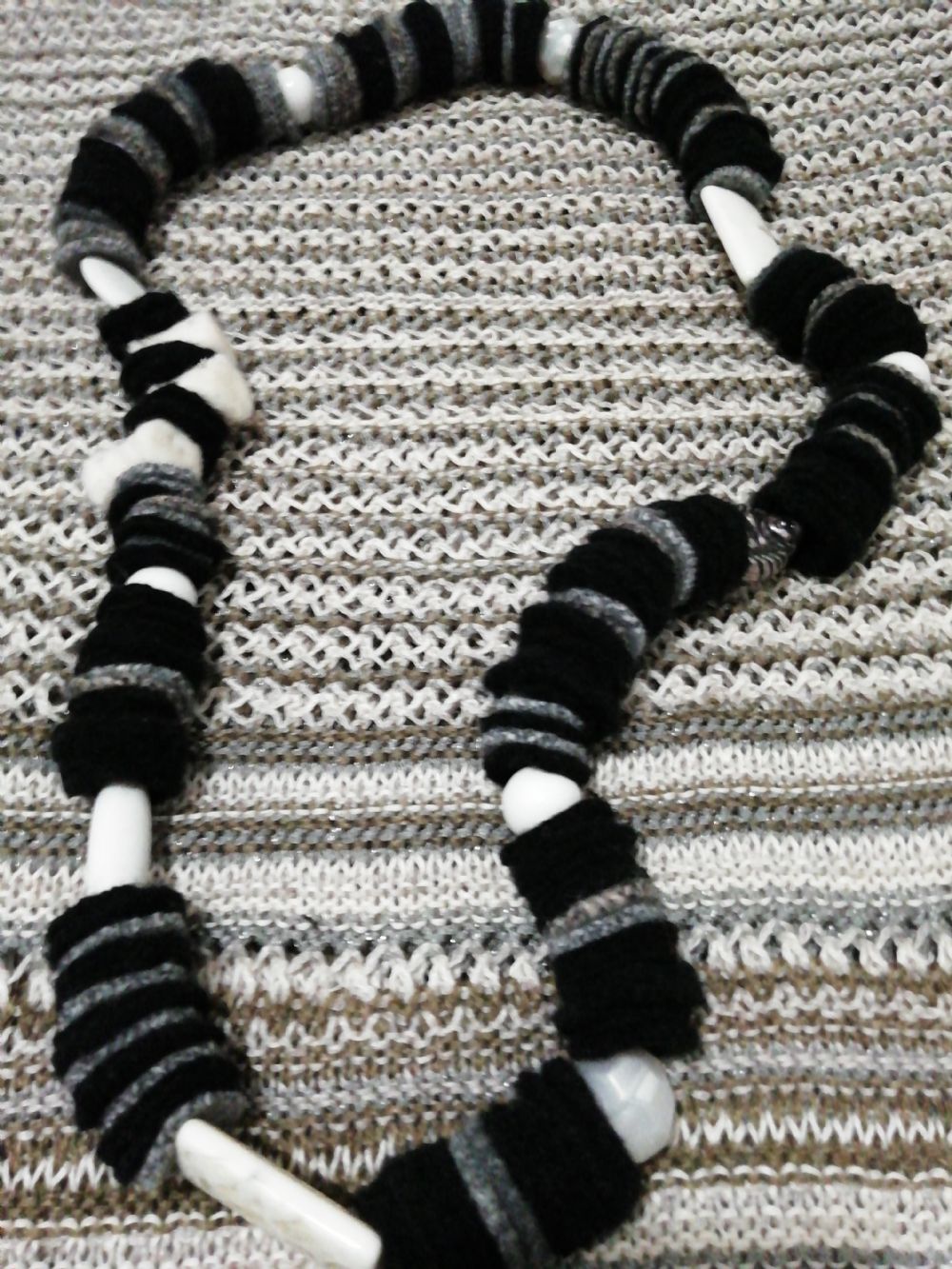 Descrizione:Più di 130 discetti di lana infeltrita ritagliati a mano, perle in acrilico e metallo