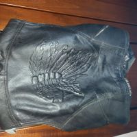 Descrizione:Gilet biker in vera pelle,foderato, con taschino interno, è stato usato tanto e la pelle ha segni di usura alle tasche. Deve essere anche portato a pulire in lavanderia. Misure: larghezza spalle cm 40,dorso al torace cm 52,lunghezza cm 69 sul davanti.