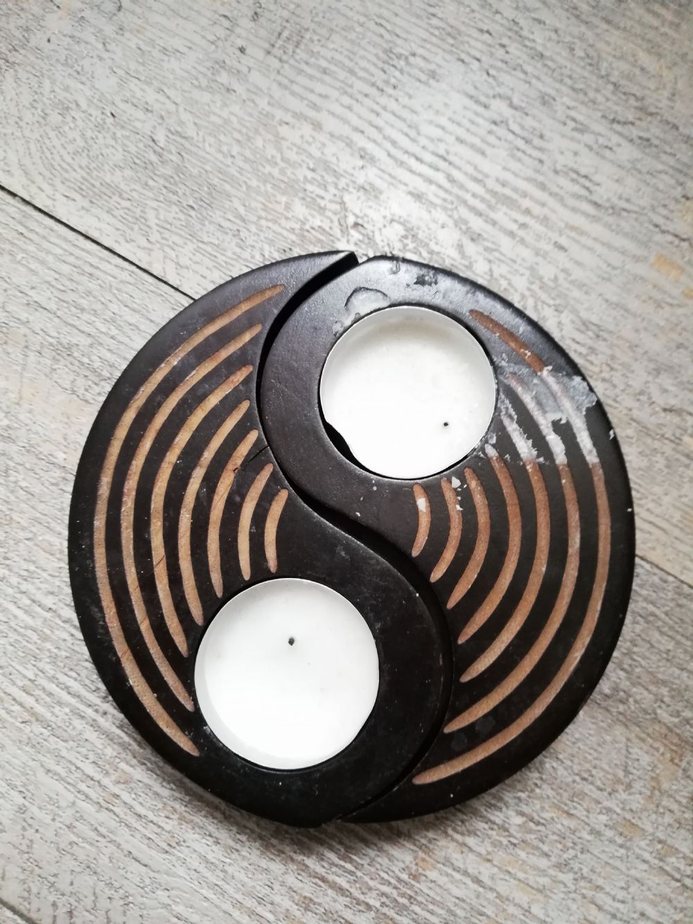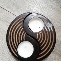 Descrizione:Porta candele in legno, con simbolo del tao.