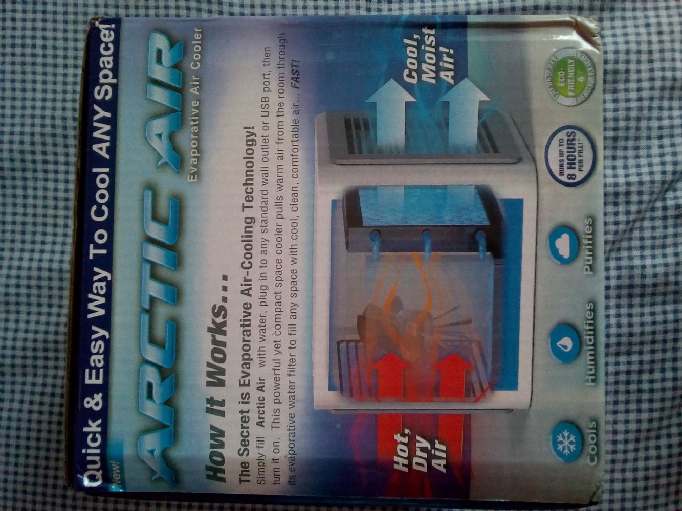 Descrizione:piccolo condizionatore. Misure 17x17x17 raffresca l'aria immediatamente circostante, a base d'acqua, consumo insignificante, colori cangianti, gradevole ecologico benchè di piccola potenza.