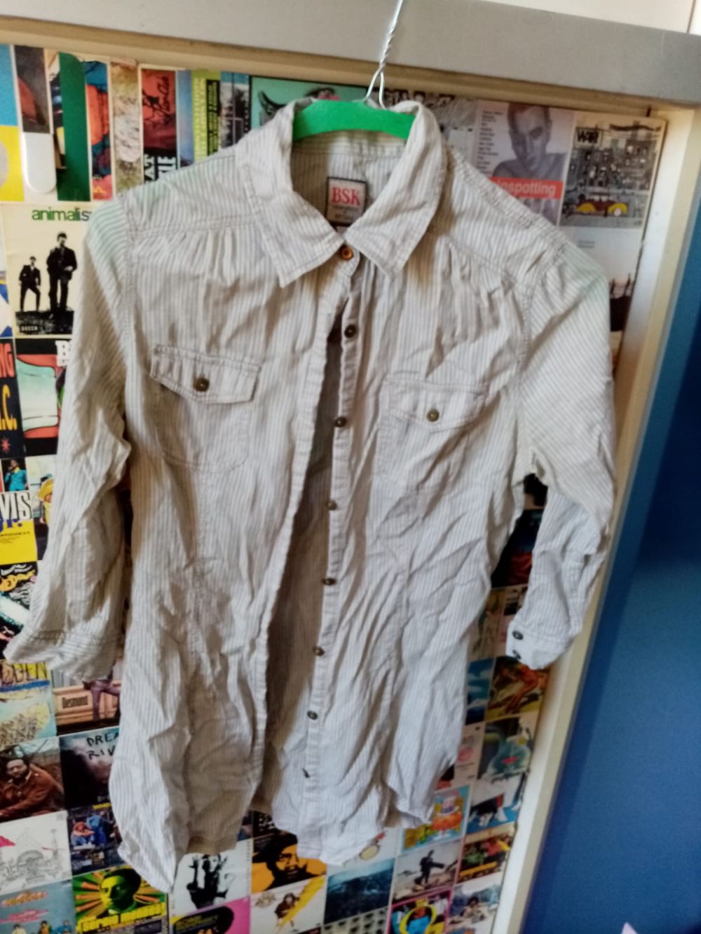 Descrizione:camicia di cotone a richine sul grigio chiaro, marca Berska, tg S, maniche a tre quarti