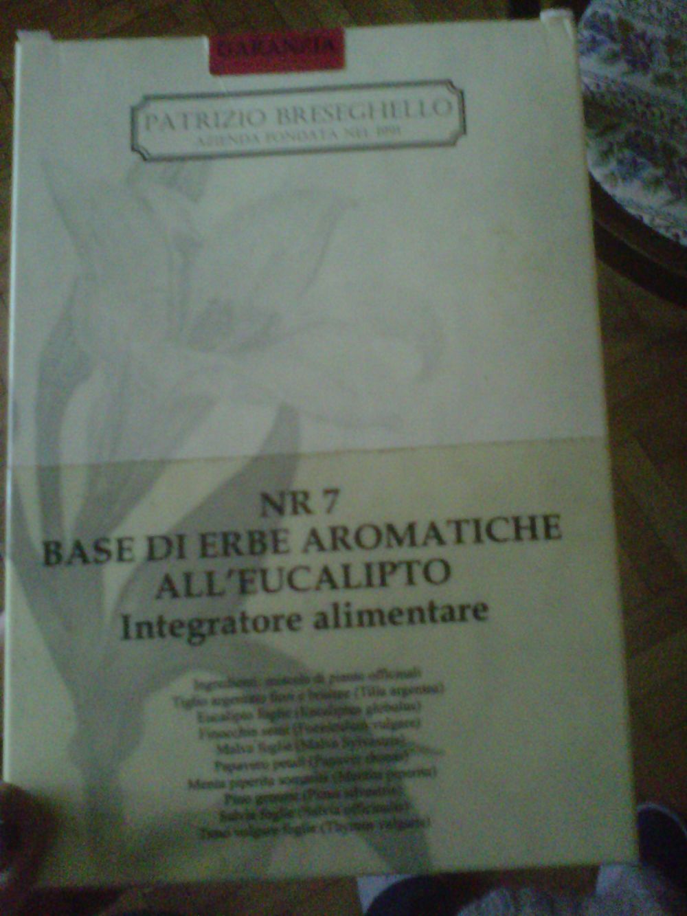 Descrizione:tisana di Patrizio Breseghello, confezione integra ma "SCADUTA" dicembre 2014, proprietà balsamiche, contiene: tiglio, eucalipto, finocchio, malva, papavero, menta, pino, salvia, timo. 100 gr