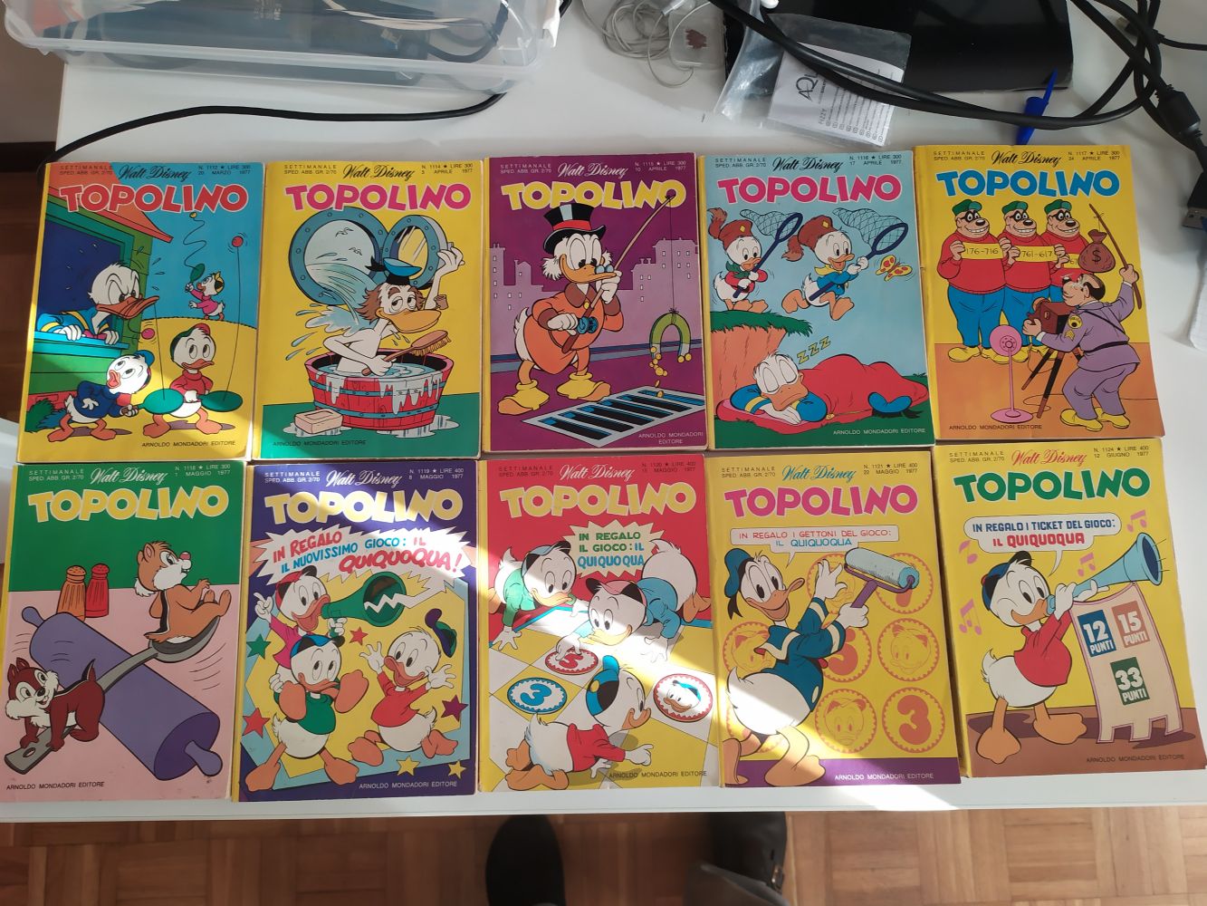 10 fumetti Topolino, dal numero 1112 del 20 marzo 1977 al numero 1124 del 12 giugno 1977, consecutivi, mancano il 1113, 1122 e 1123. In perfette condizioni