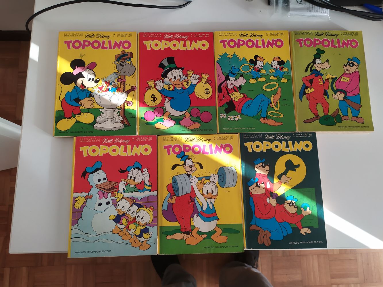 Descrizione:7 fumetti Topolino, dal numero 1140 del 2 ottobre al numero 1150 dell'11 dicembre 1977, consecutivi, mancano 1143, 1144, 1146 e 1147. In perfette condizioni