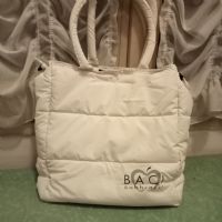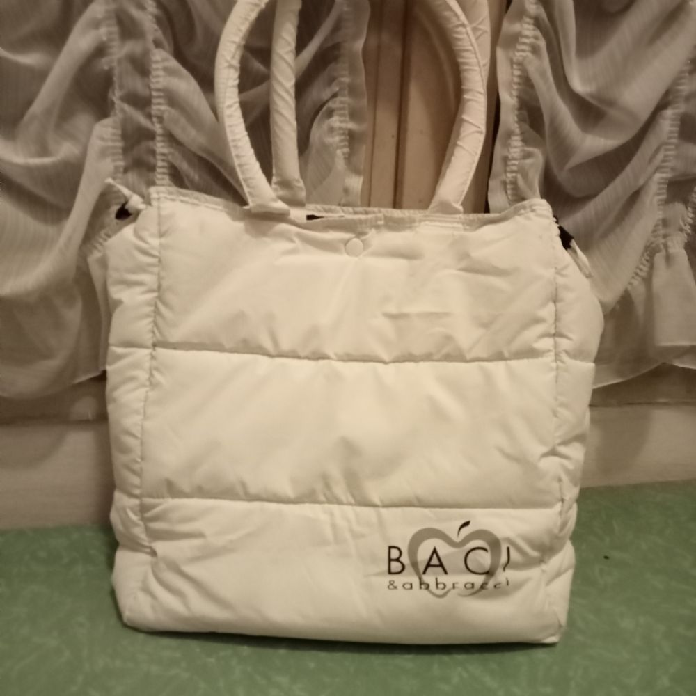 Borsa Baci e Abbracci bianca, come se fosse un piumino. Bianca, capiente, a spalla. Sì chiude con cordino e clip.
