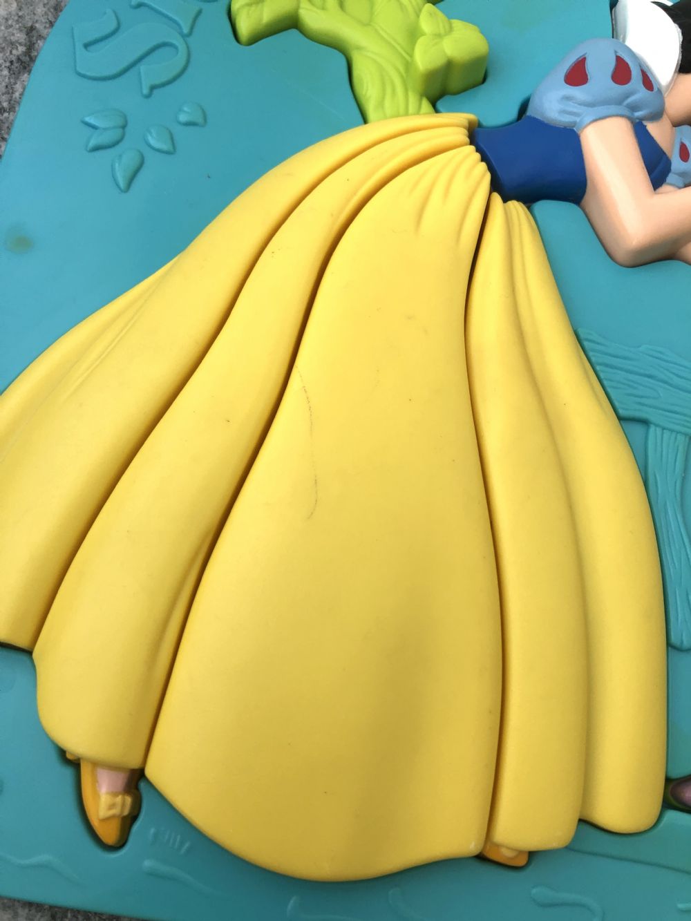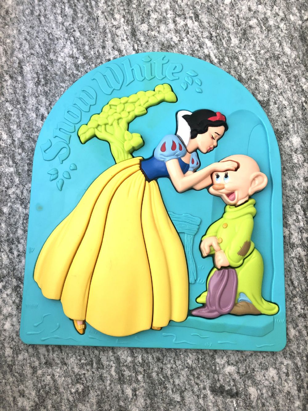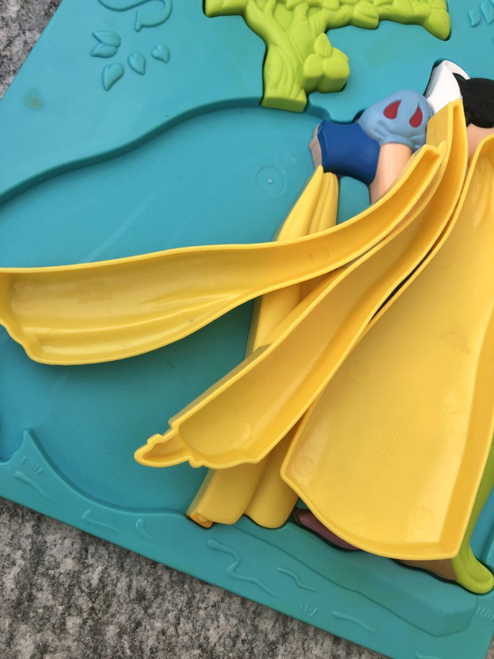 Tenuto in armadio, lavato ed igienizzato prima di fare l’annuncio. Ha qualche piccolo segno ( vedere foto) : la plastica dello sfondo ha in pochi punti delle alonature più gialle, la gonna di Biancaneve ha un piccolo segno sulla gonna gialla . Nessuna mancanza o rottura.