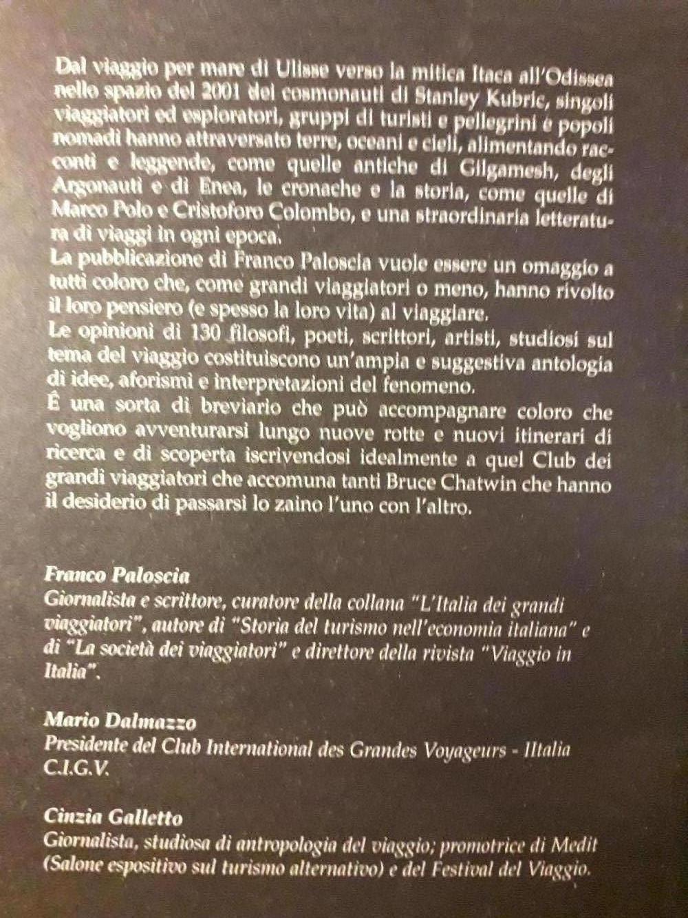 Propongo indissolubilmente insieme a "Da Itaca alla luna, breviario per viaggiatori" curata da Franco Paloscia: raccolta di brani, aforismi e pensieri di vari autori, celebri e meno celebri, da Socrate ad Huxley all'antico proverbio genovese "è meglio consumare le scarpe che le lenzuola".
