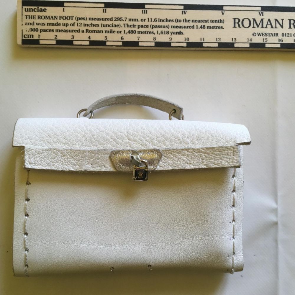 Astuccio fatto a mano, chiuso con velcro, in pelle bianca.