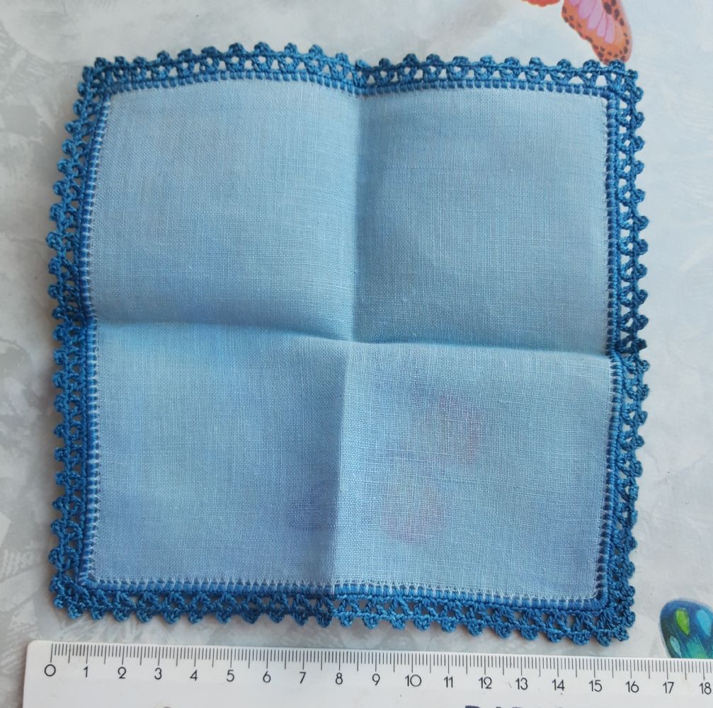 Regalo centrino azzurro, quadrato, con bordino fatto all'uncinetto.