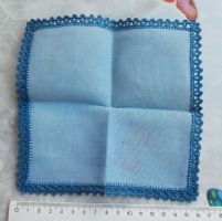 Descrizione:Regalo centrino azzurro, quadrato, con bordino fatto all'uncinetto.