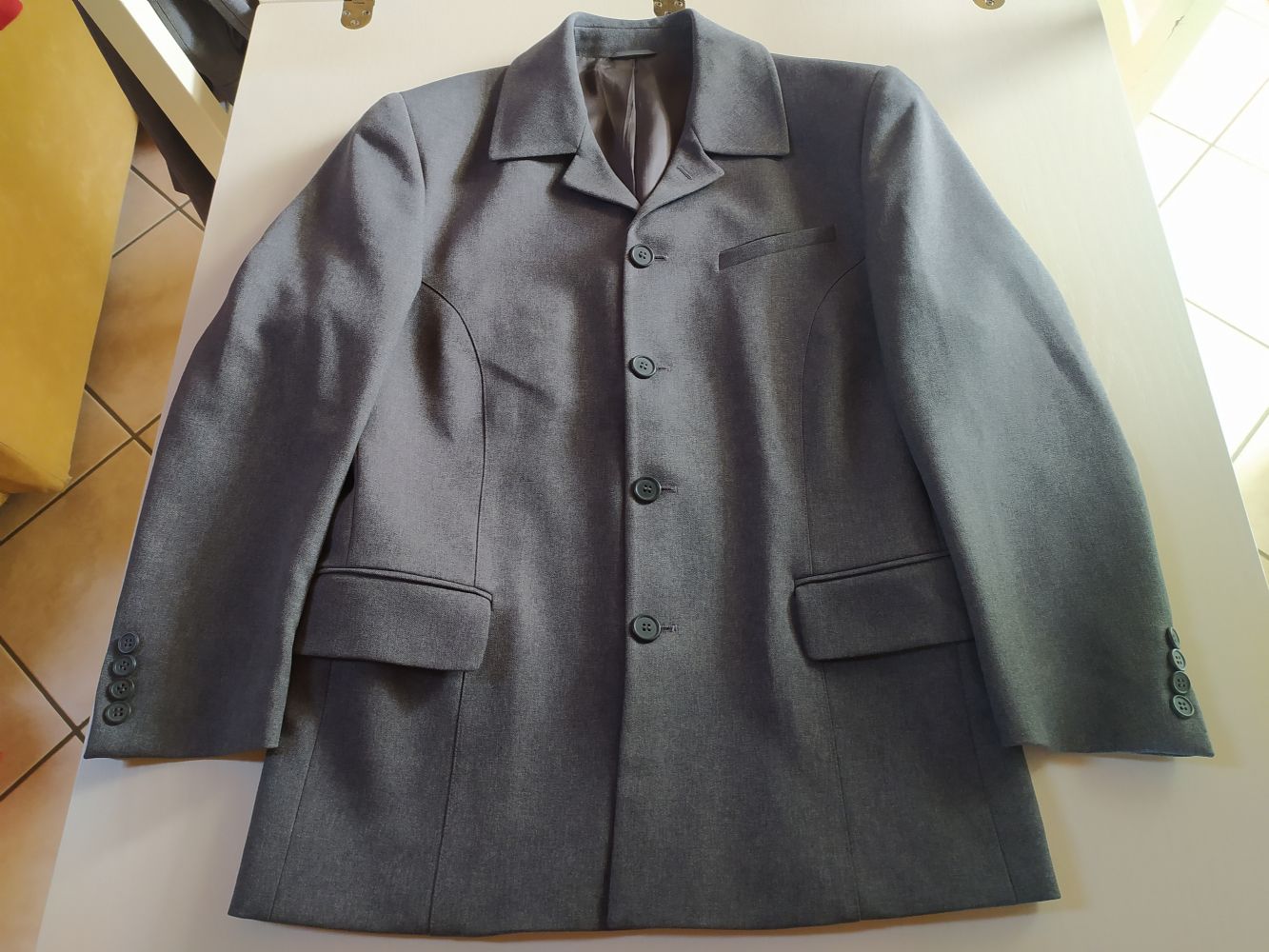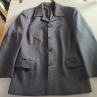 Completo grigio tg 44 100% poliestere, invernale, giacca foderata spalle cm 44, ascelle cm 52, lunghezza cm 72, pantaloni vita cm 39, lunghezza cm 94.
