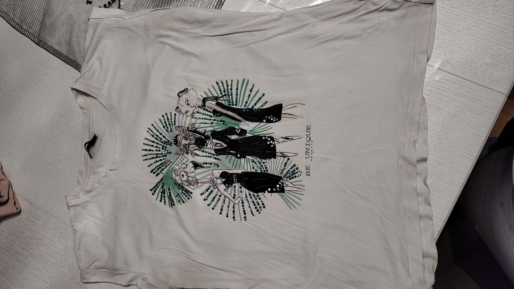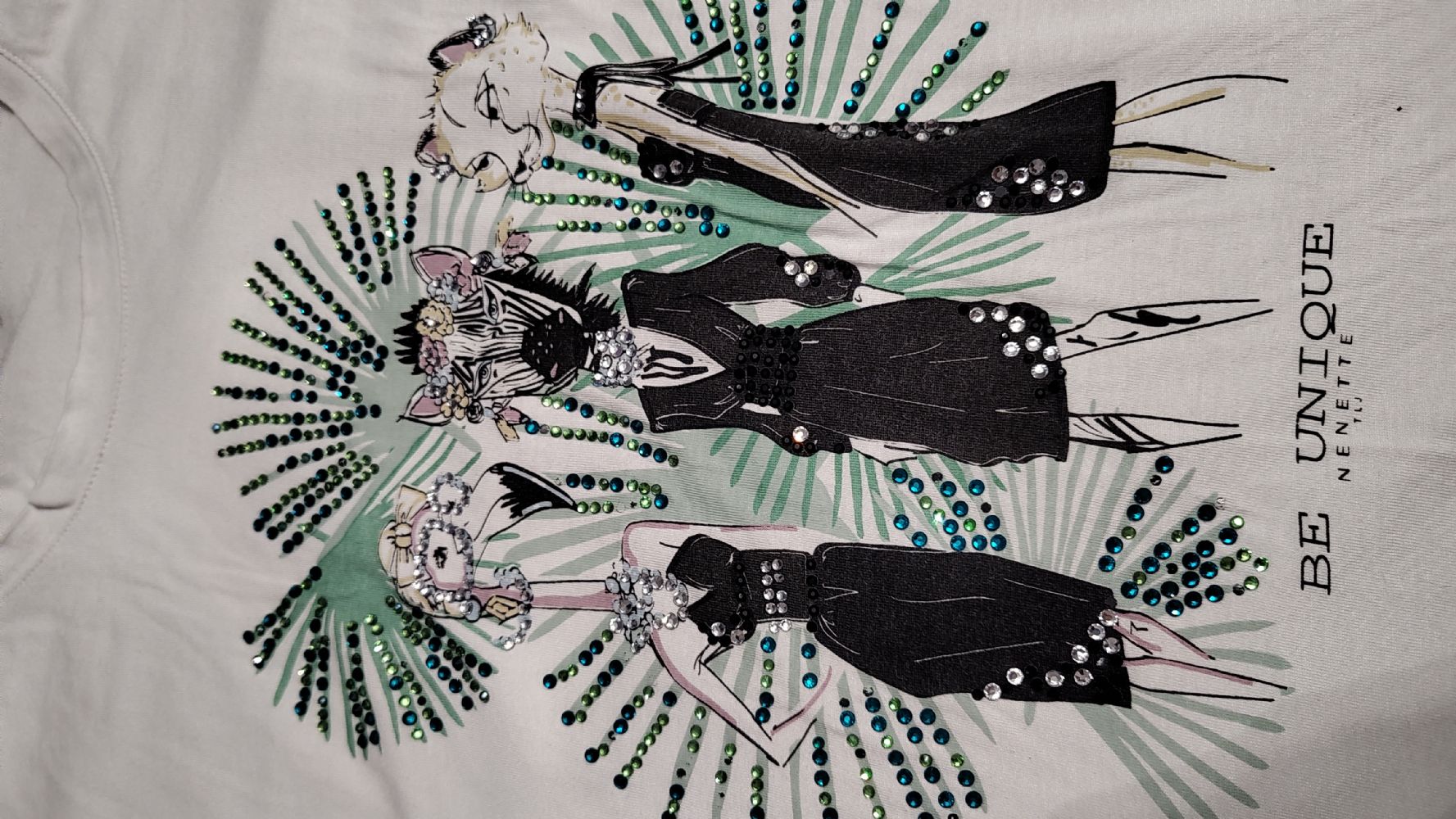 Versatile maglietta in misto cotone molto morbida. Applicazione con strass con verde e nero di fondo. Buone condizioni.