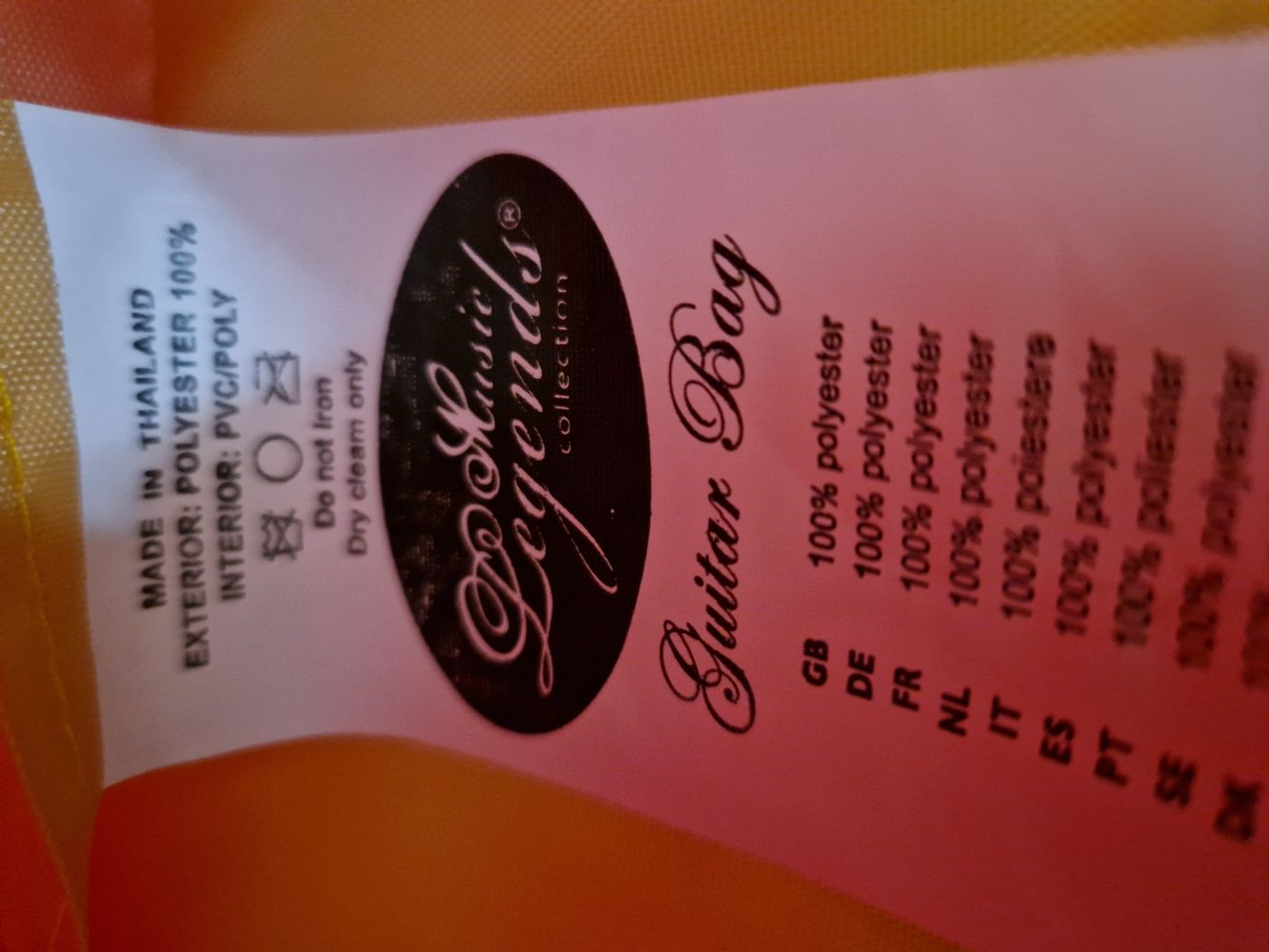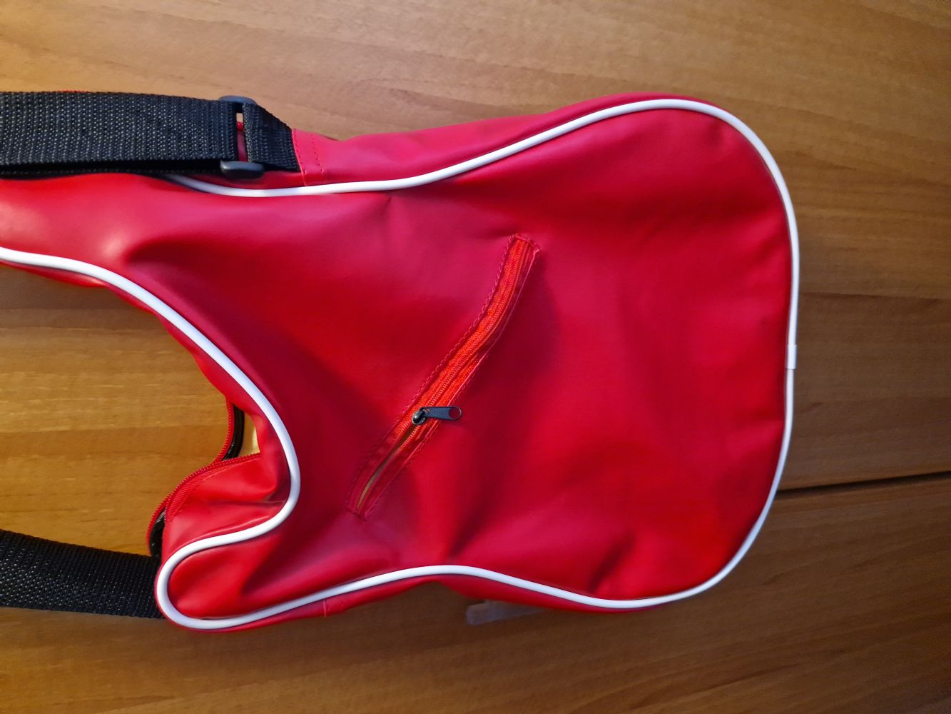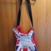Curiosa borsa a forma di chitarra misure ca cm 31 x 38 profonda 5.5 cm .in materiale poliestere esterno pvc interno. All''interno sono presenti due tasche sul retro altra tasca chiusa con cerniera tracolla regolabile