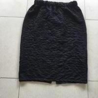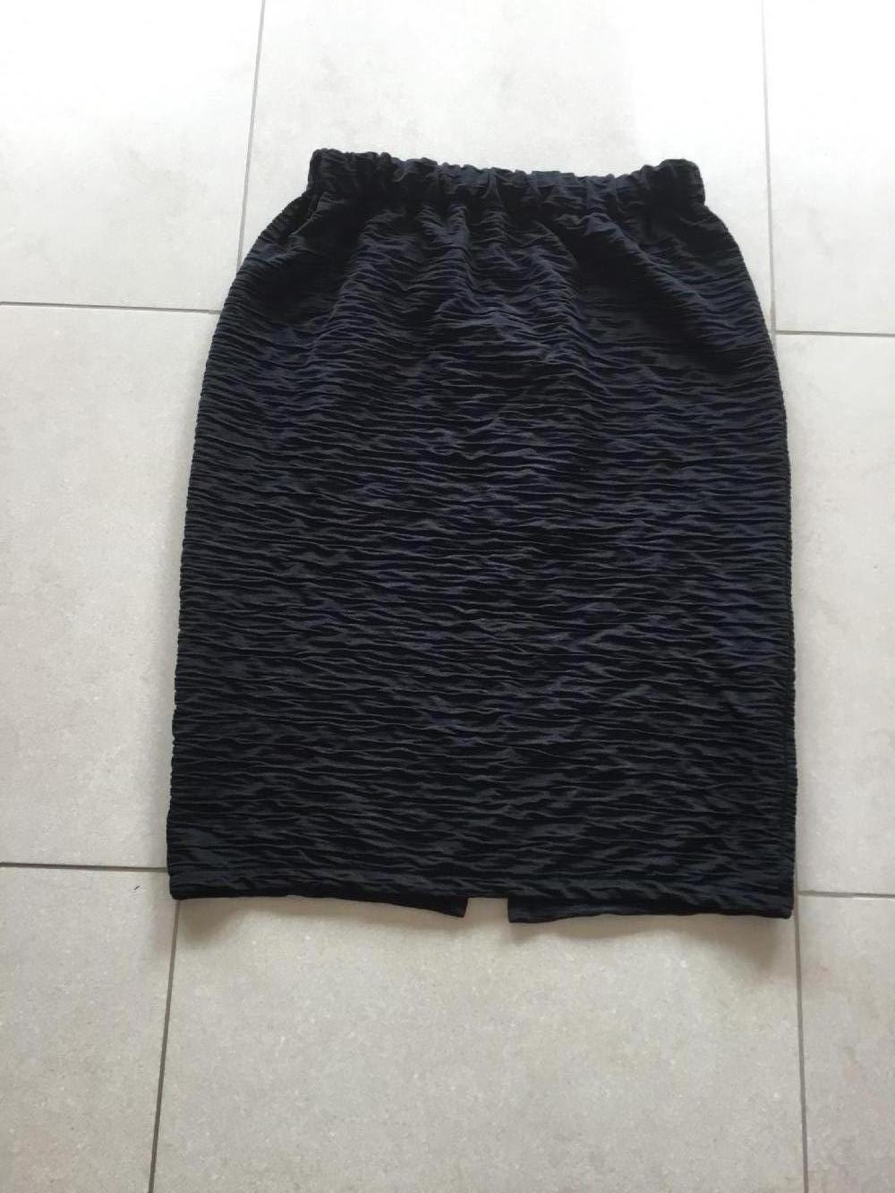 Descrizione:Gonna nera in tessuto goffrato. Elastico in vita e spacchetto centrale sul dietro.